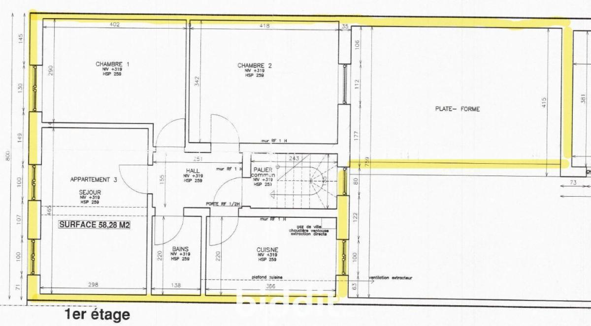 - Logement du rez-de-chaussée, n°73A : Entrée privative, grand séjour avec coin cuisine, une chambre, salle de douche avec wc, d’une surface de 59 mètres carrés.