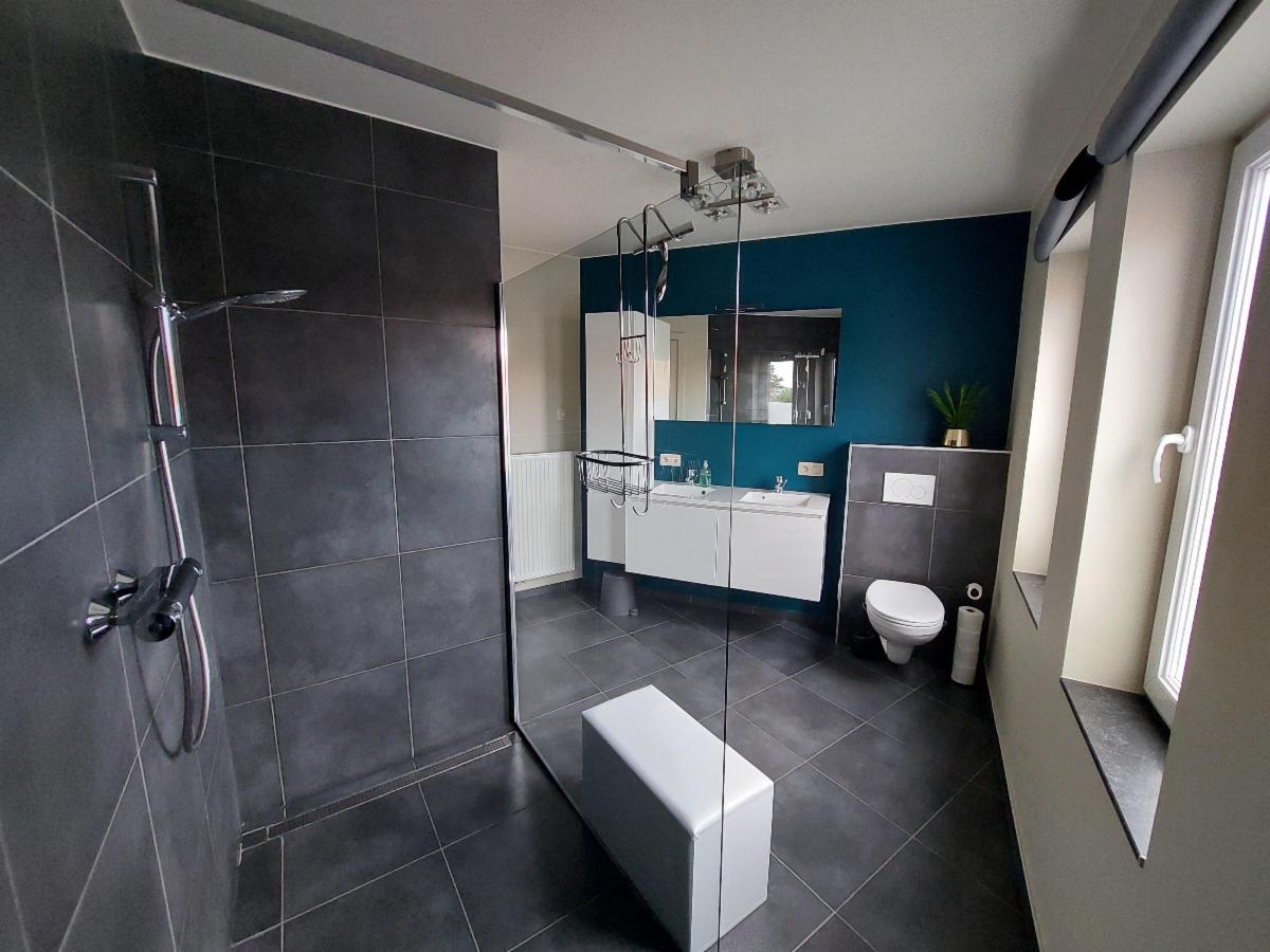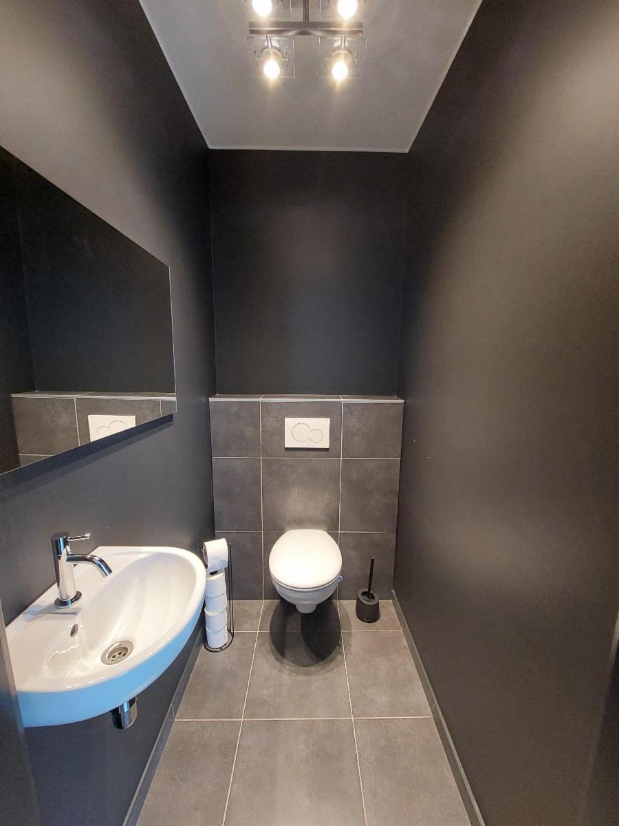 • 1e verdieping: nachthal, een zeer ruime slaapkamer, een tweede, kleinere slaapkamer die momenteel dienst doet als dressing en een moderne badkamer met inloopdouche, dubbele lavabo en toilet.