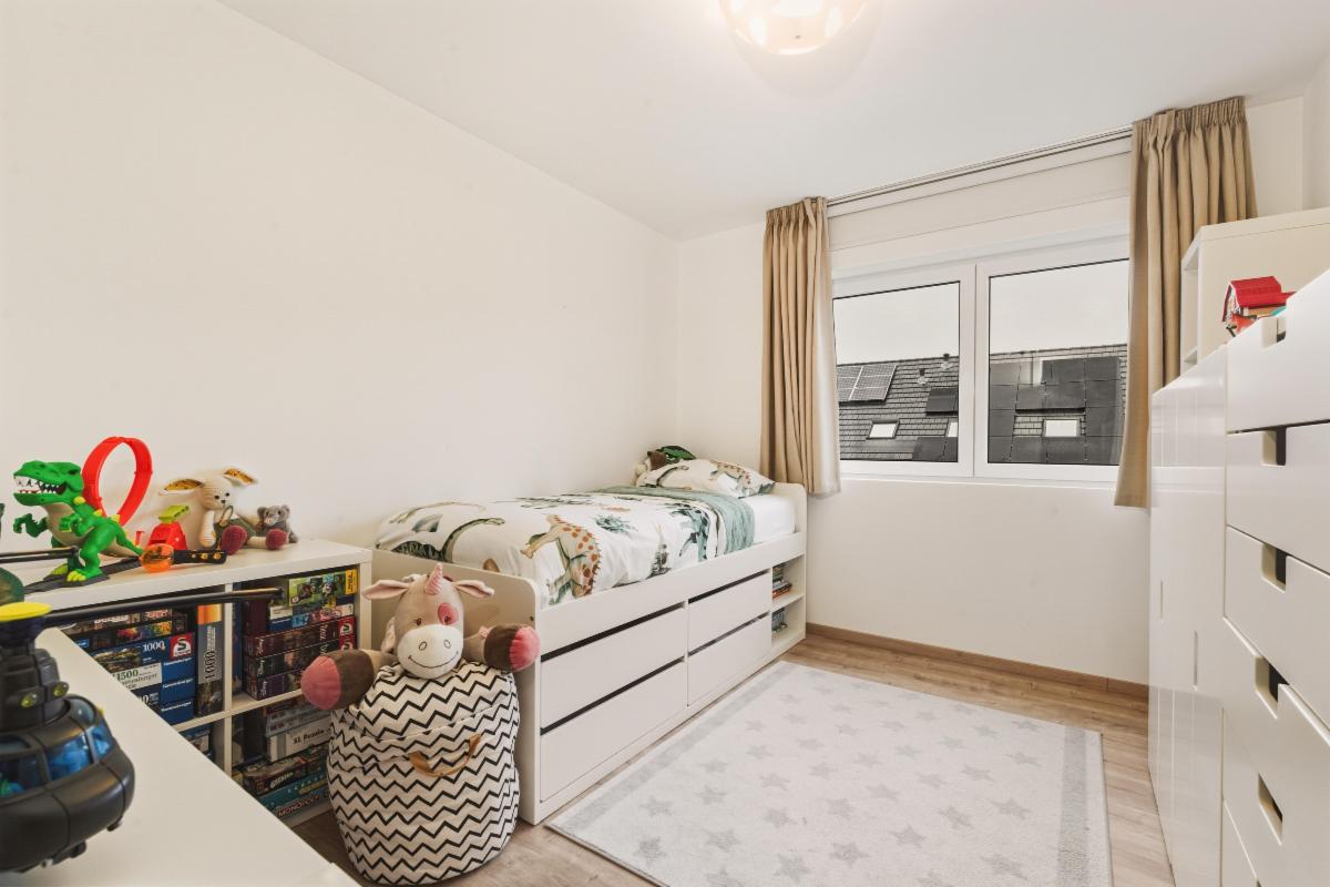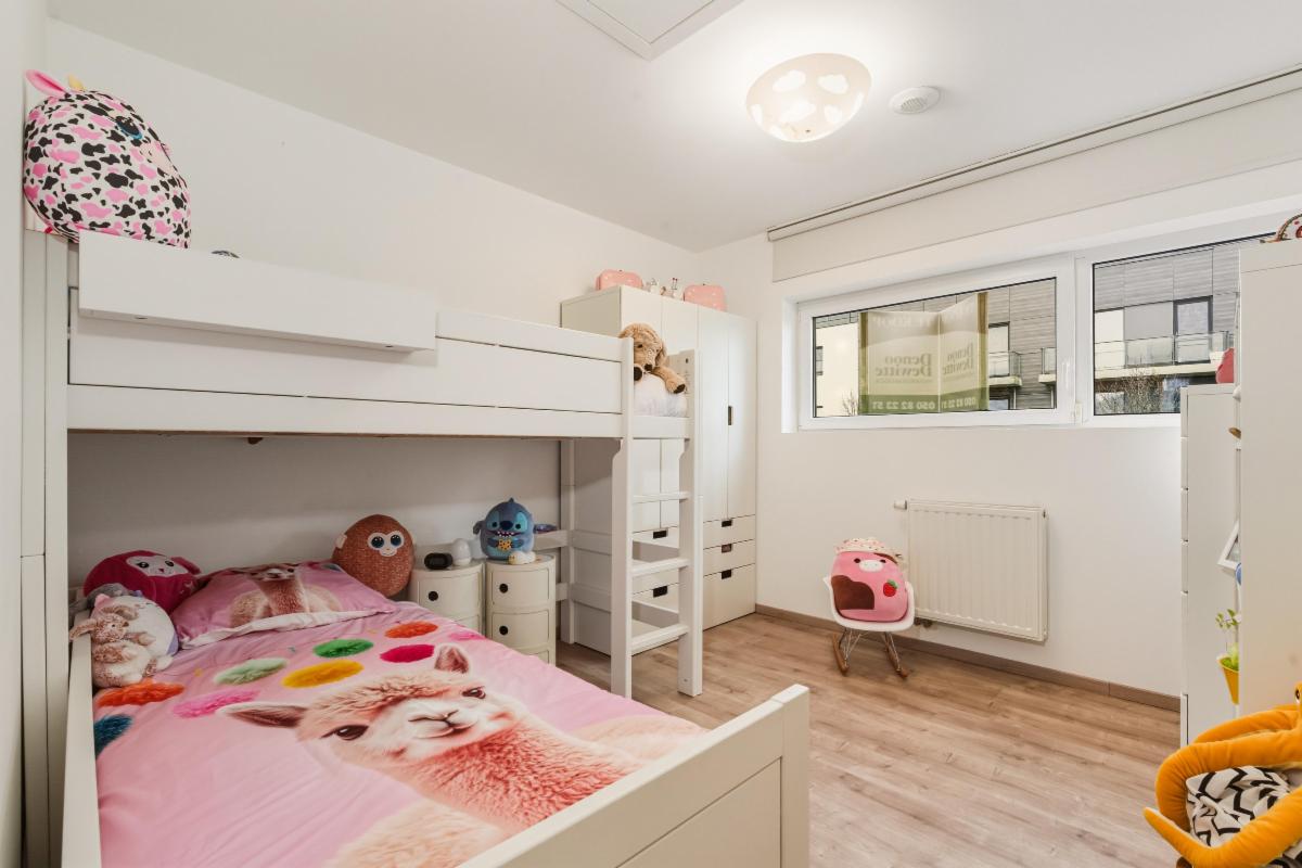 De inkomhal, waar zich het gastentoilet bevindt, geeft toegang tot de lichtrijke leefruimte. De gezellige living sluit naadloos aan op de open en volledig geïnstalleerde keuken. Het grote schuifraam zorgt voor een mooie lichtinval en geeft directe toegang tot de onderhoudsvriendelijke tuin — perfect om te genieten van zonnige dagen of gezellige avonden buiten.