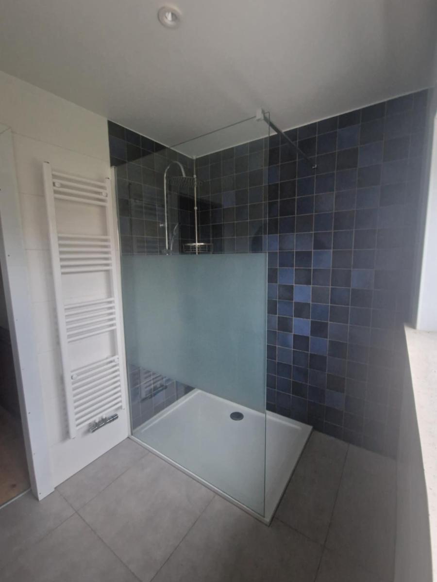 De vernieuwde badkamer beschikt over een dubbele lavabo, ruime inloopdouche en handdoekradiator.