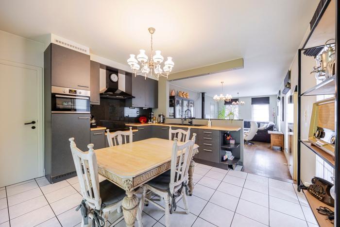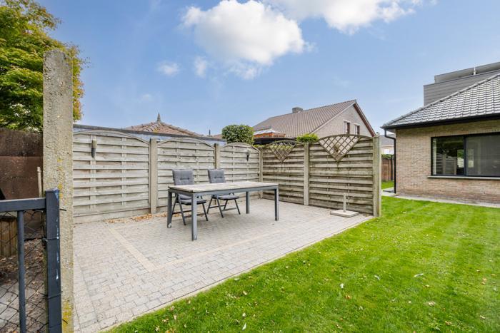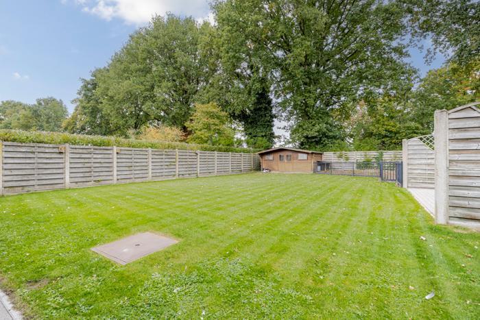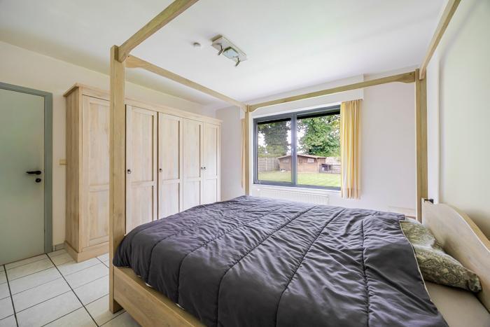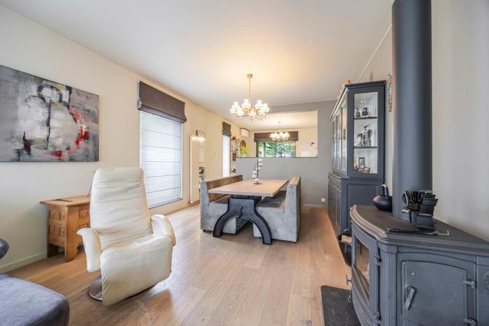 Op het gelijkvloers bevindt zich een ruime slaapkamer, ideaal als master bedroom. Er is een tweede slaapkamer waar momenteel een sauna staat. Deze blijft in de woning aanwezig. De leefruimte omvat een gezellige zithoek met kachel, een eetruimte en een halfopen keuken. Dankzij de grote raampartijen geniet je van veel lichtinval en een vlotte verbinding met het overdekte terras en de ruime, verzorgde tuin met aparte zithoek. Daarnaast is er een apart gastentoilet, een wasruimte, een inpandige garage met extra bergruimte én een carport voorzien van een aansluiting voor een laadpaal.