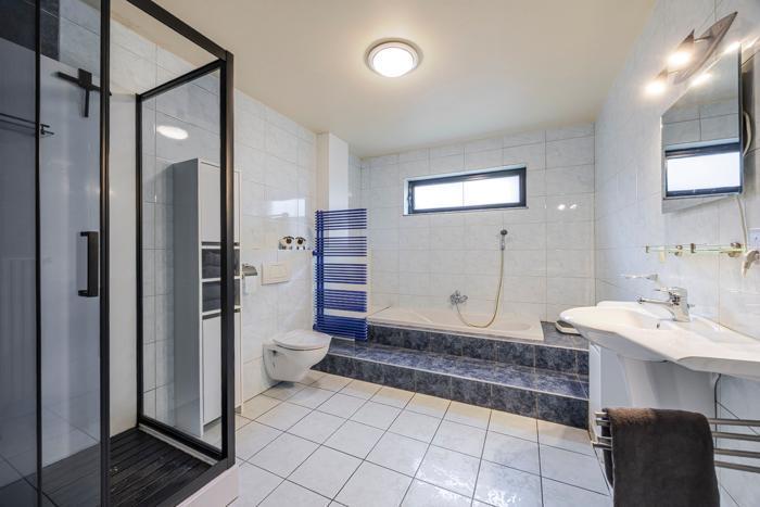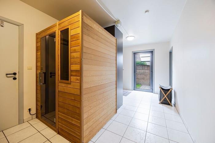 De woning beschikt over twee badkamers: een gelijkvloerse badkamer met ligbad, toilet en vernieuwde douche, en een volledig gerenoveerde badkamer op de bovenverdieping met regendouche, verdoken toilet en moderne afwerking.