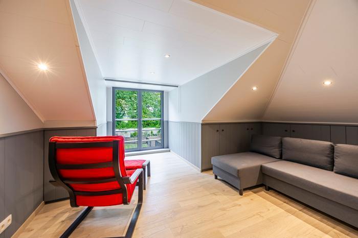 Op de bovenverdieping bevinden zich meerdere slaapkamers, waaronder een zeer ruime kamer die momenteel dienst doet als hobbyruimte. Aansluitend vind je een praktische bergruimte die perfect kan worden ingericht als dressing. Daarnaast is er nog een extra ruimte van 23 m² die naar eigen wens kan worden afgewerkt — ideaal als extra slaapkamer, bureau of speelkamer. De woning is voorzien van videobewaking, zonnepanelen, carport en regenwaterput.