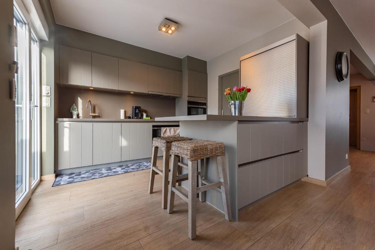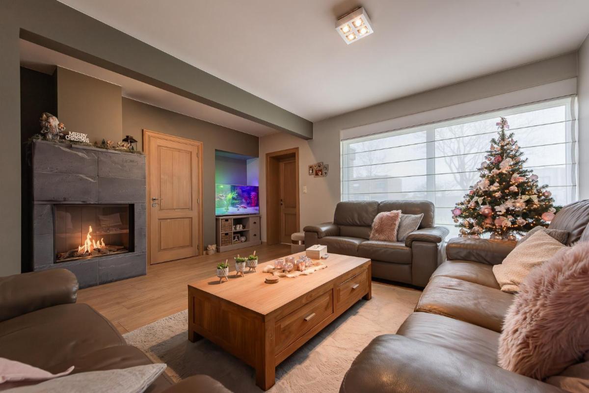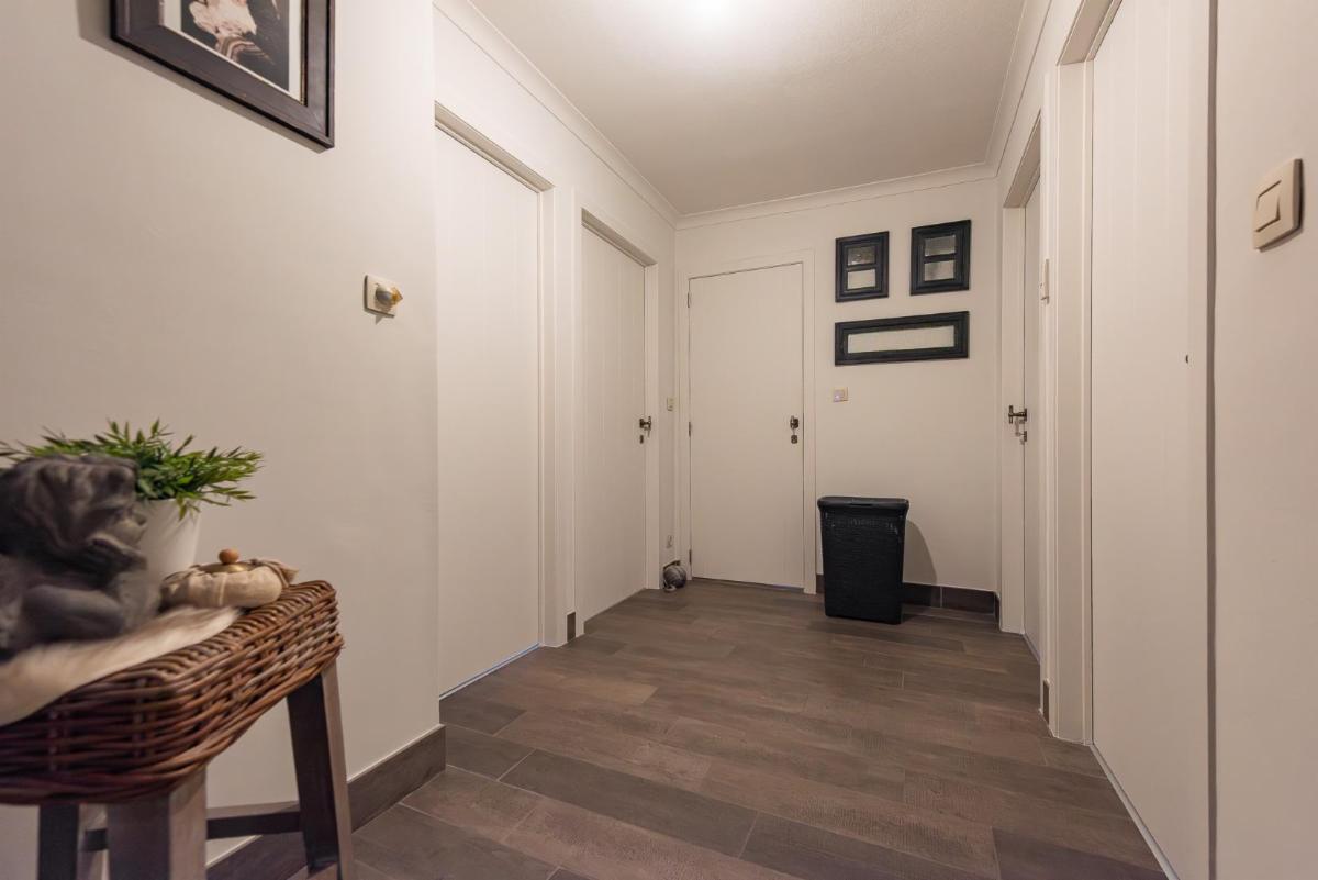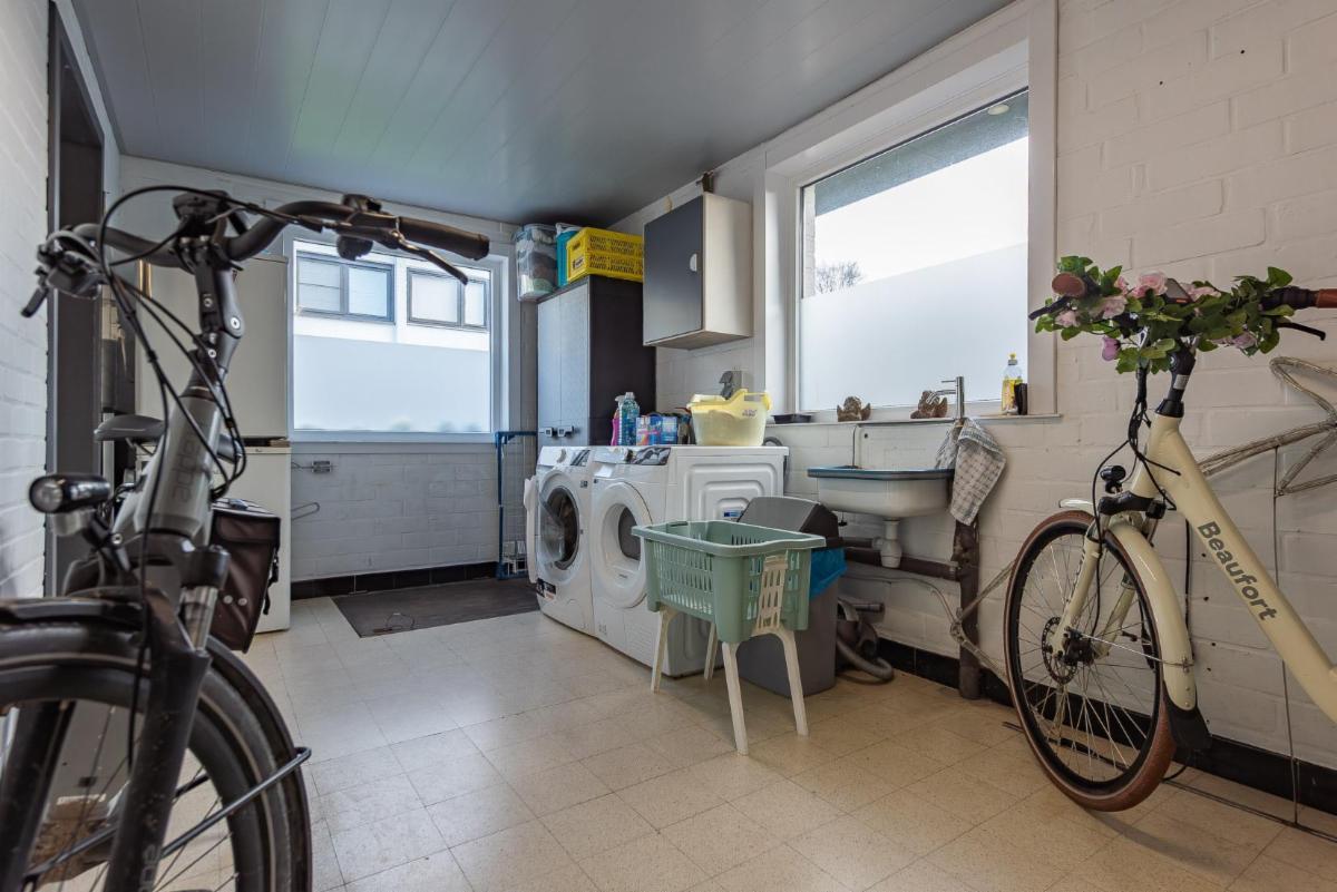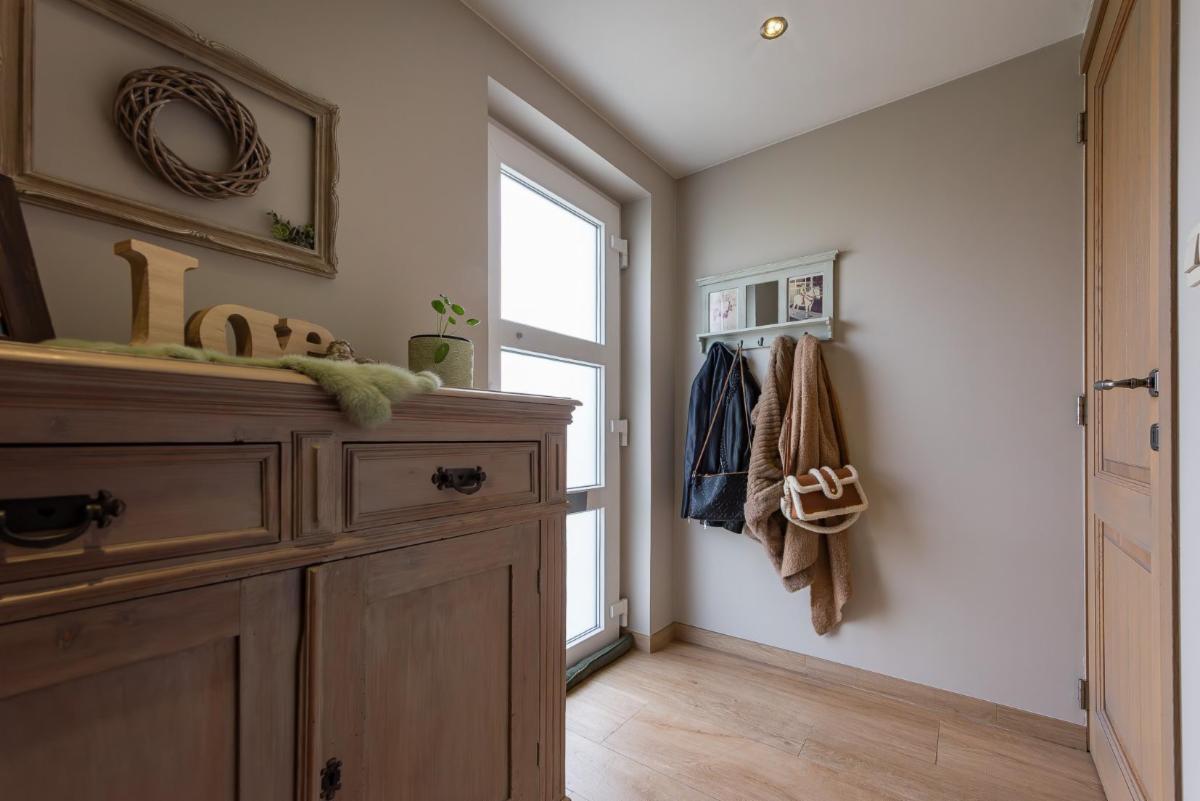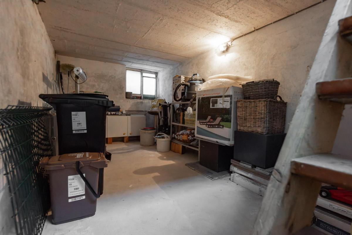 inkomhal met gastentoilet, lichtrijke leefruimte met gashaard (bekleed met speksteen), die naadloos verbonden is met de open volledig geïnstalleerde keuken met aanpalende berging.