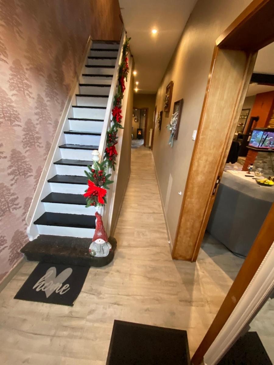 Rez: hall, salon avec poêle pellets, salle à manger, cuisine équipée avec lave-vaisselle, taques induction, hotte, four, évier (sans frigo) et poêle pellets, wc.