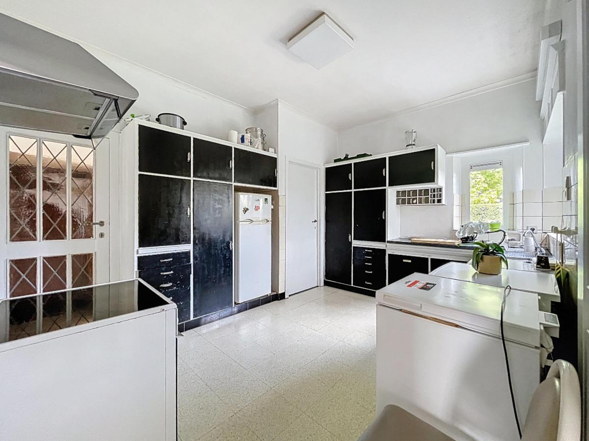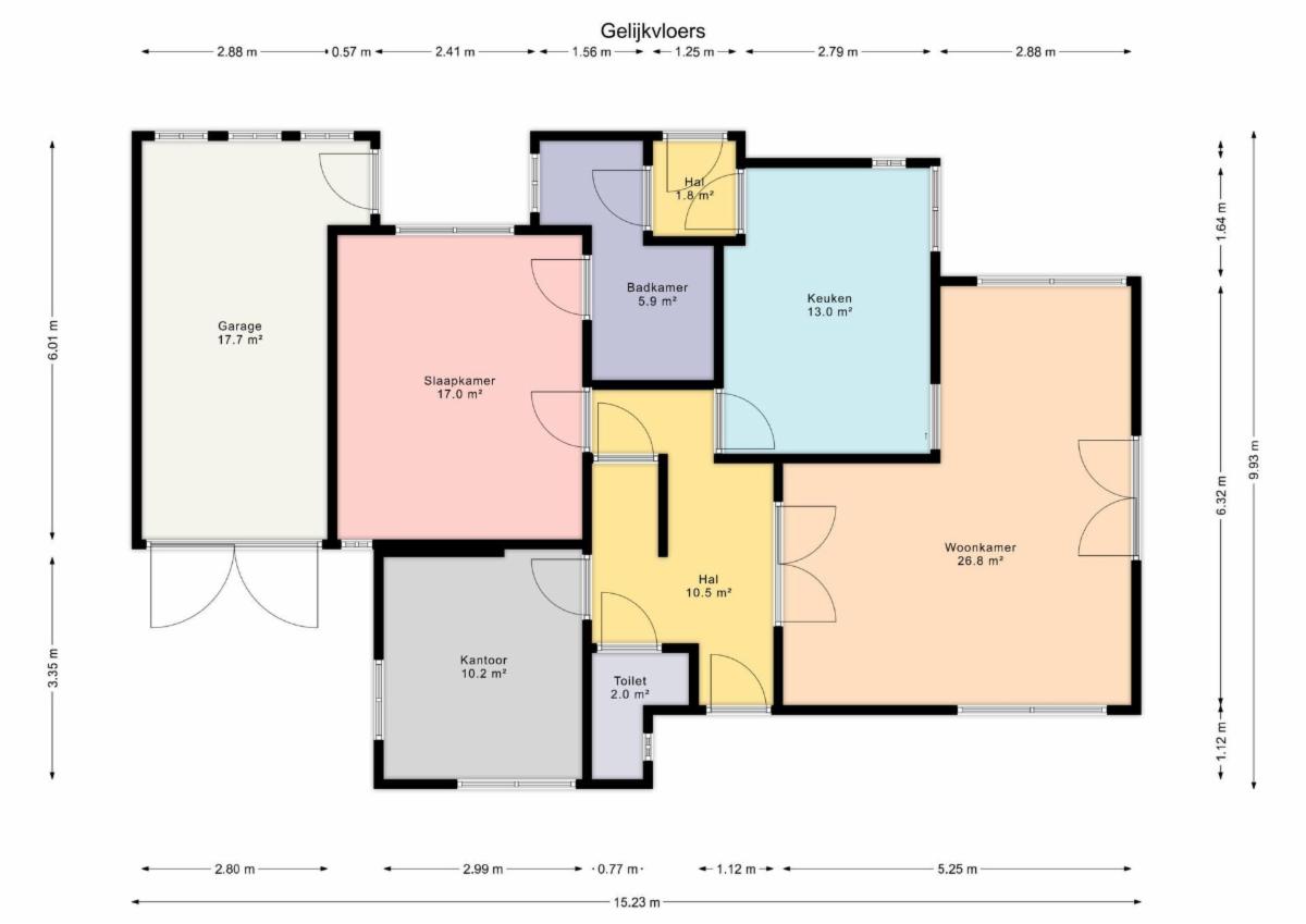 Gelijkvloers: inkomhal, wc, bureauruimte, woon- en eetkamer met stijlvolle binnendeuren, ruime keuken, badkamer met douche, berging of hobbyruimte alsook een garage;