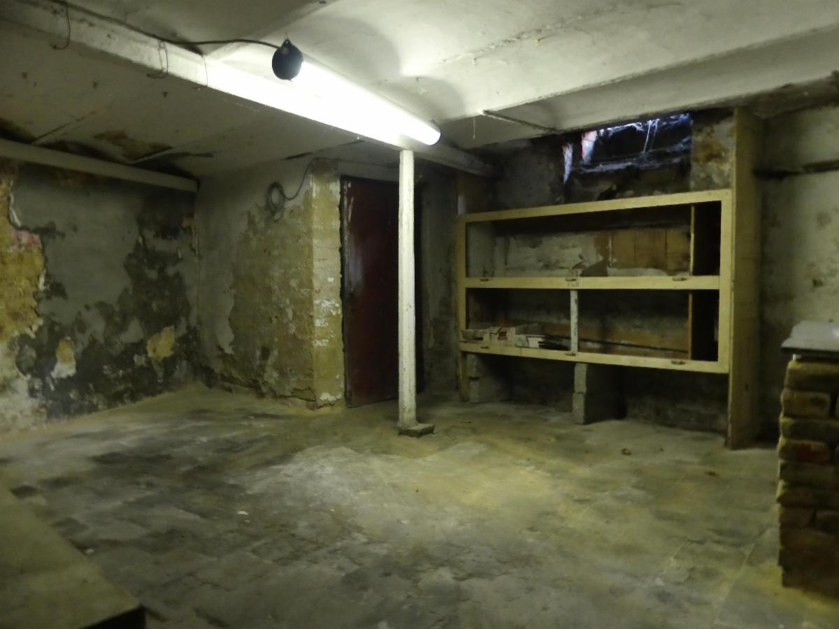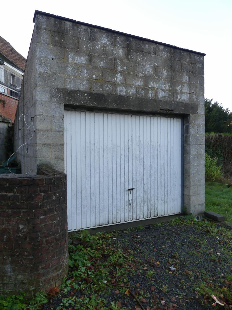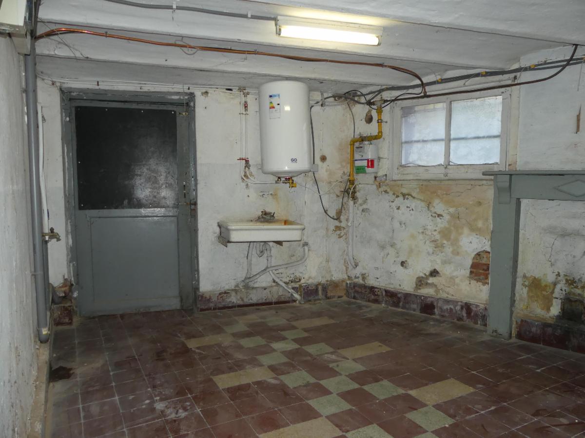 Rez : living, cuisine semi-équipée, salle de douche, 2 caves, cour, remise, garage, jardin