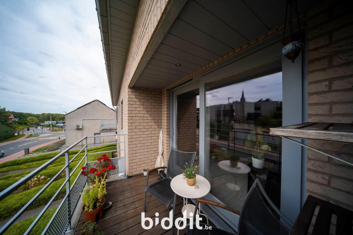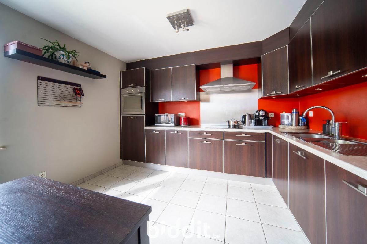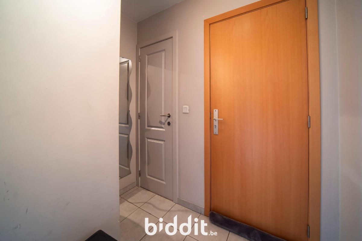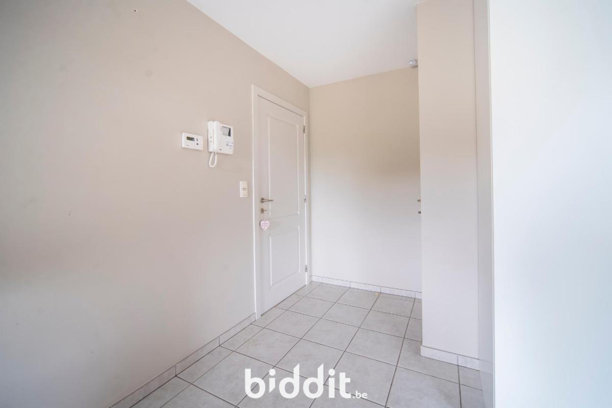 - op de 1e verdieping : inkom met wc, living met terras en open keuken (met 4 elektrische kookplaten, gootsteen, vaatwasser, oven en frigo), opbergruimte en parlofoon;