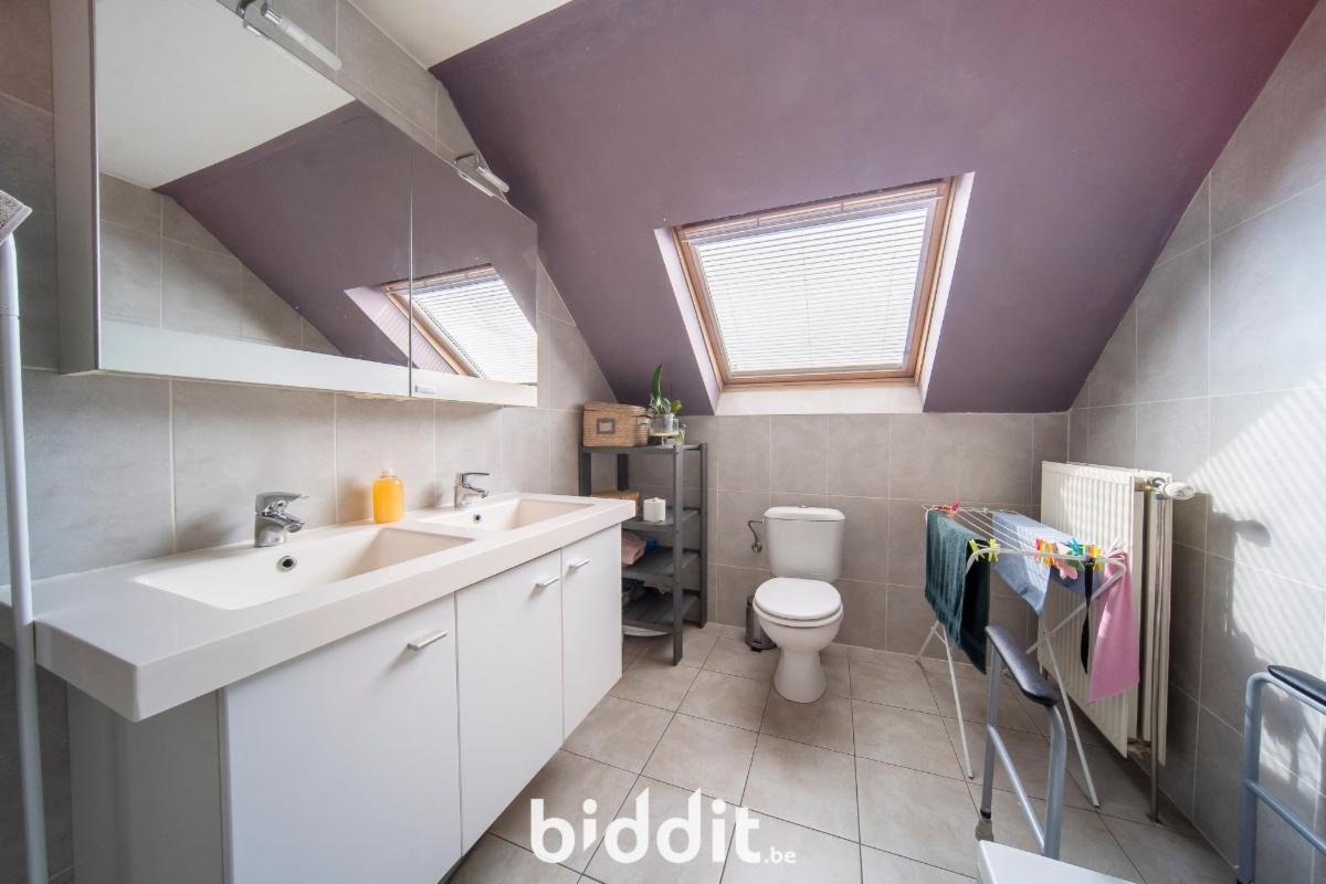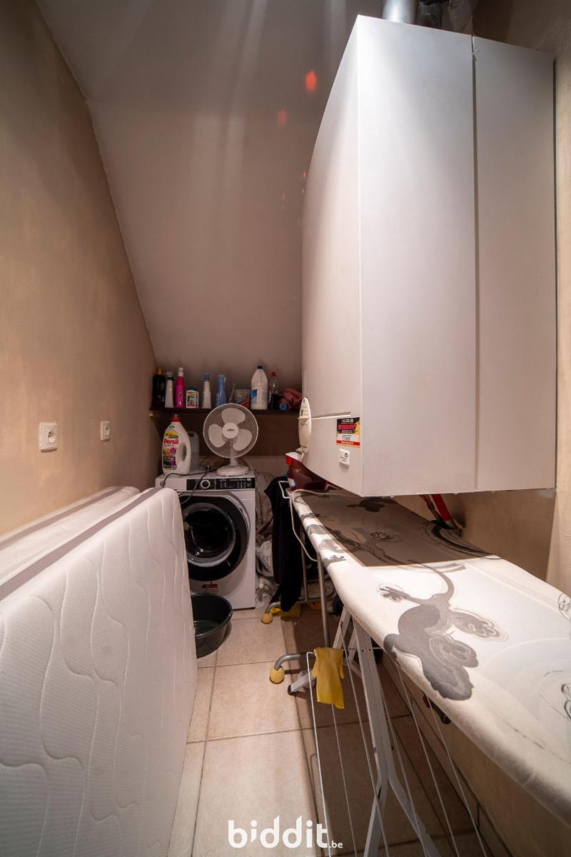 - op de 2e verdieping: 2 slaapkamers (grote kast inbegrepen), opbergruimte met verwarmingsketel op gas, badkamer met bad, dubbele lavabo en wc;