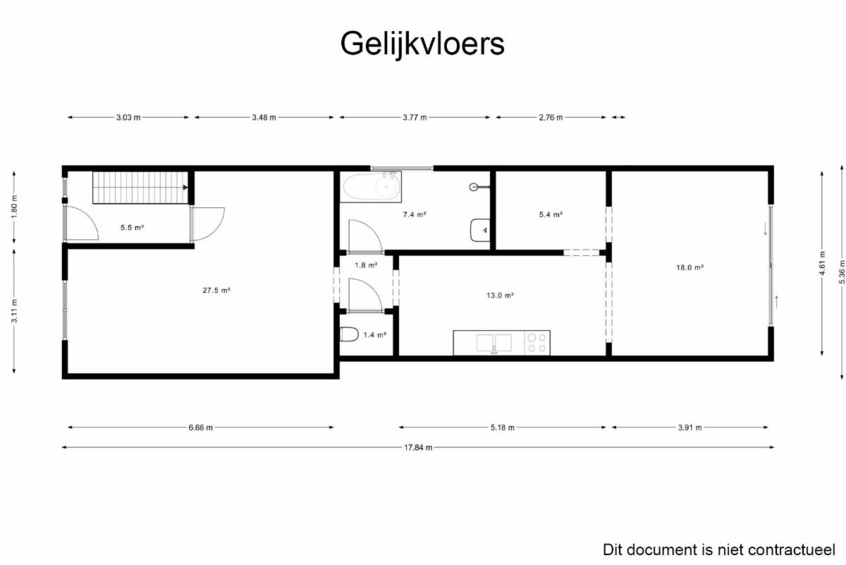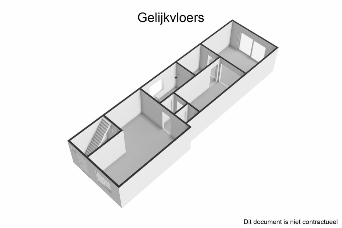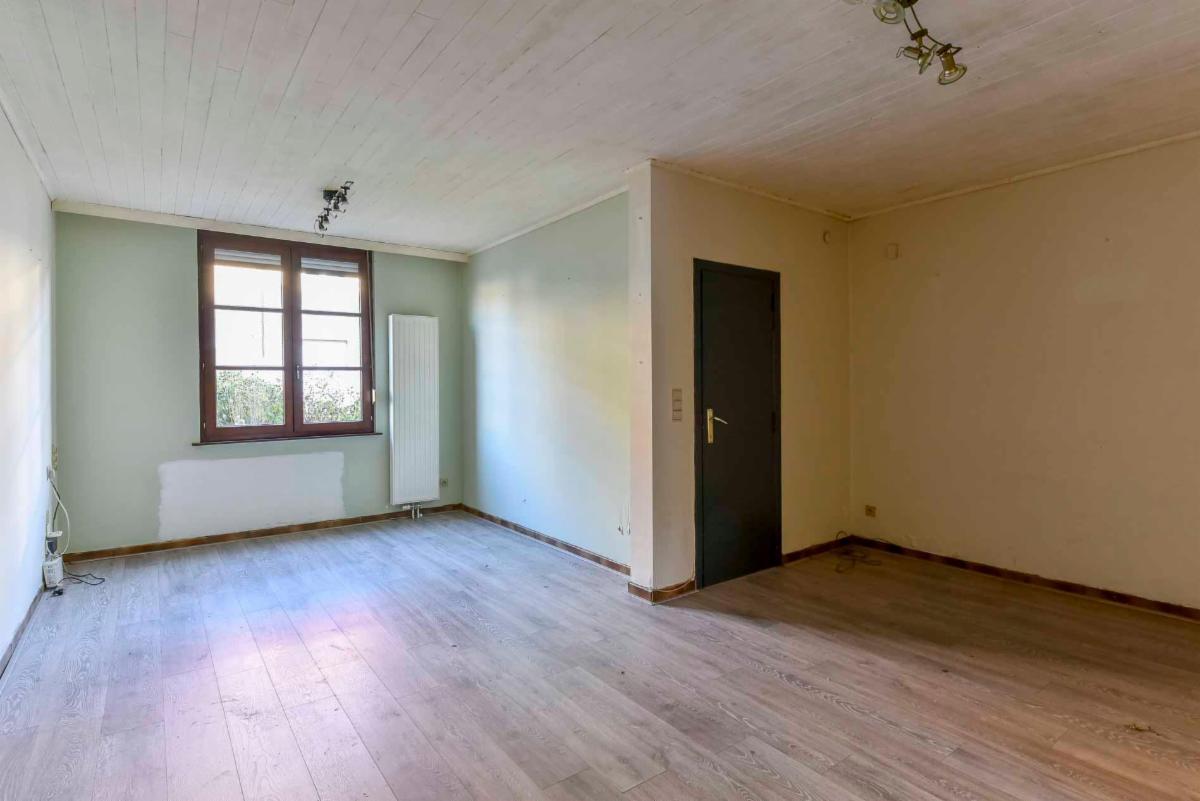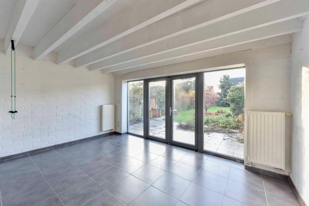 - gelijkvloers: inkomhal met trap, woonkamer, eetkamer, keuken, badkamer, aparte wc en tuin;