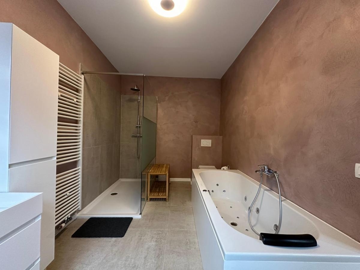 Op de eerste verdieping bevindt zich de royale master bedroom volledig voorzien van ingemaakte kasten, daarnaast vindt u een luxe badkamer uitgerust met een inloopdouche en bubbelbad, alsook een apart toilet. De bovenverdieping herbergt twee ruime slaapkamers en een extra douchekamer met toilet – perfect voor een gezin, gasten of als thuiskantoor.