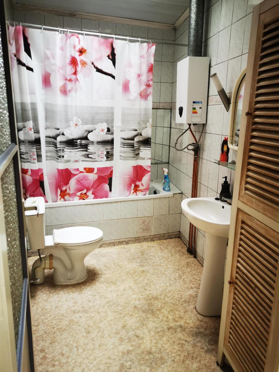 - Au rez-de-chaussée : hall d’entrée avec escalier, séjour avec poêle et cheminée (salon – SAM), cuisine semi-équipée, sdb avec baignoire, évier et wc – chauffe-eau récent