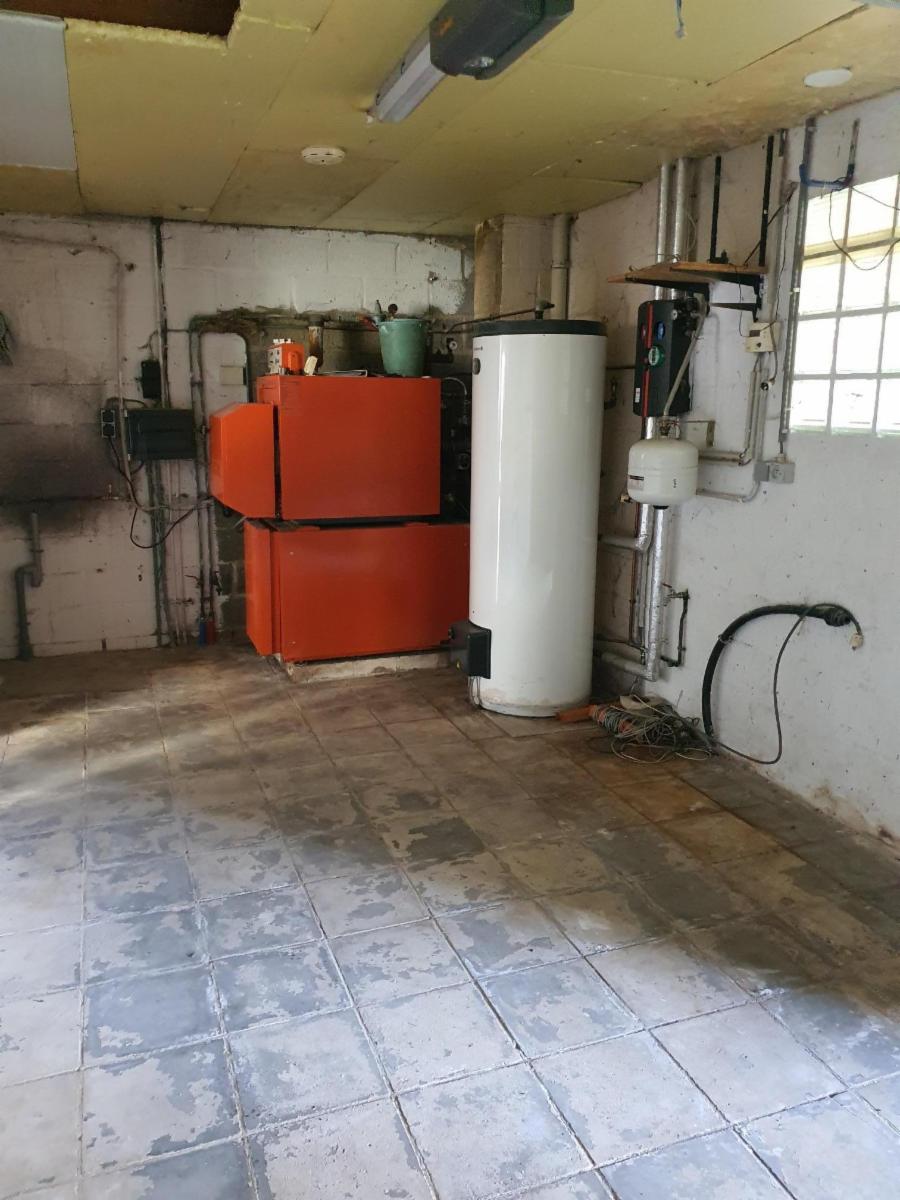 Aspects techniques : chauffage central au mazout, chauffe-eau relié à deux panneaux solaires, citerne à eau de pluie, châssis double vitrage en bois, etc.