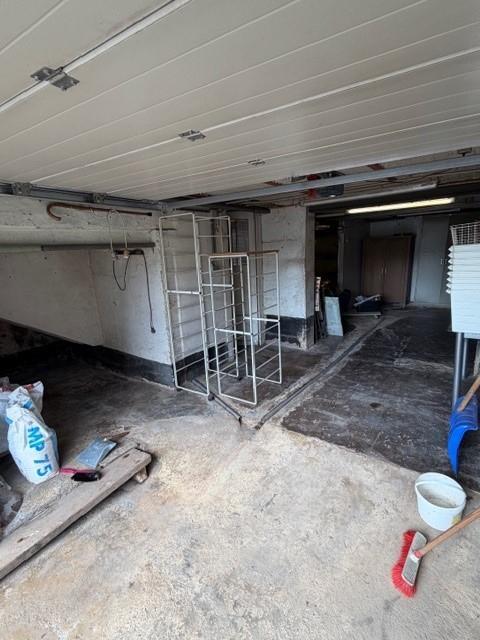 Garage pouvant contenir une voiture (porte électrique sectionnelle) avec un espace de rangement.