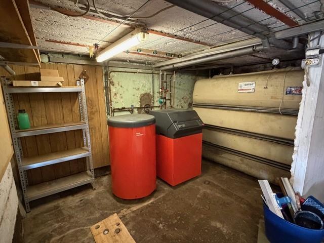 Une cave avec chaudière au mazout Weishaupt ainsi qu’un boiler.