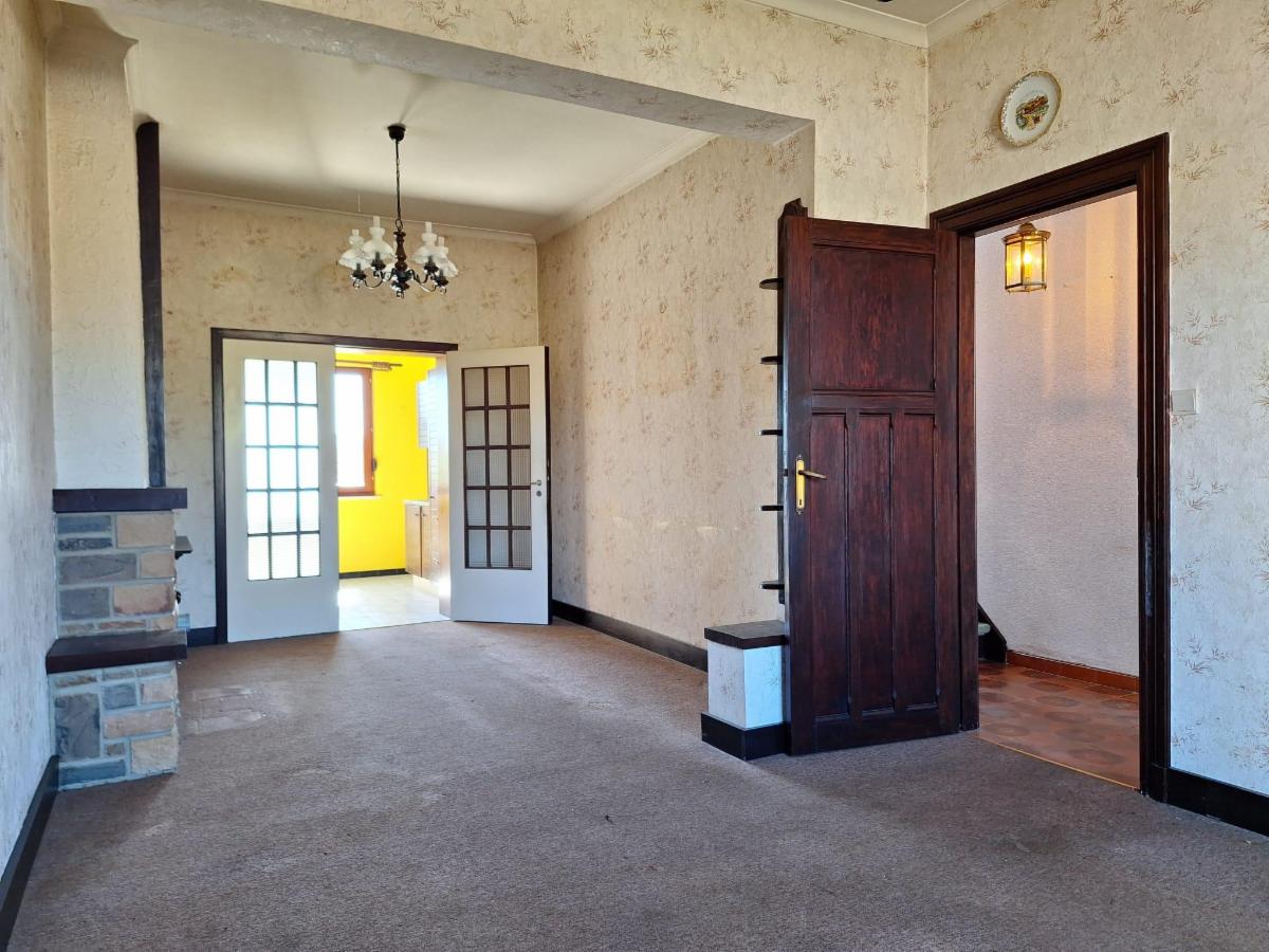 Rez-de-Chaussée : hall d’entrée, living avec poêle, cuisine équipée (ancienne) et salle de bains (bain, WC et évier).