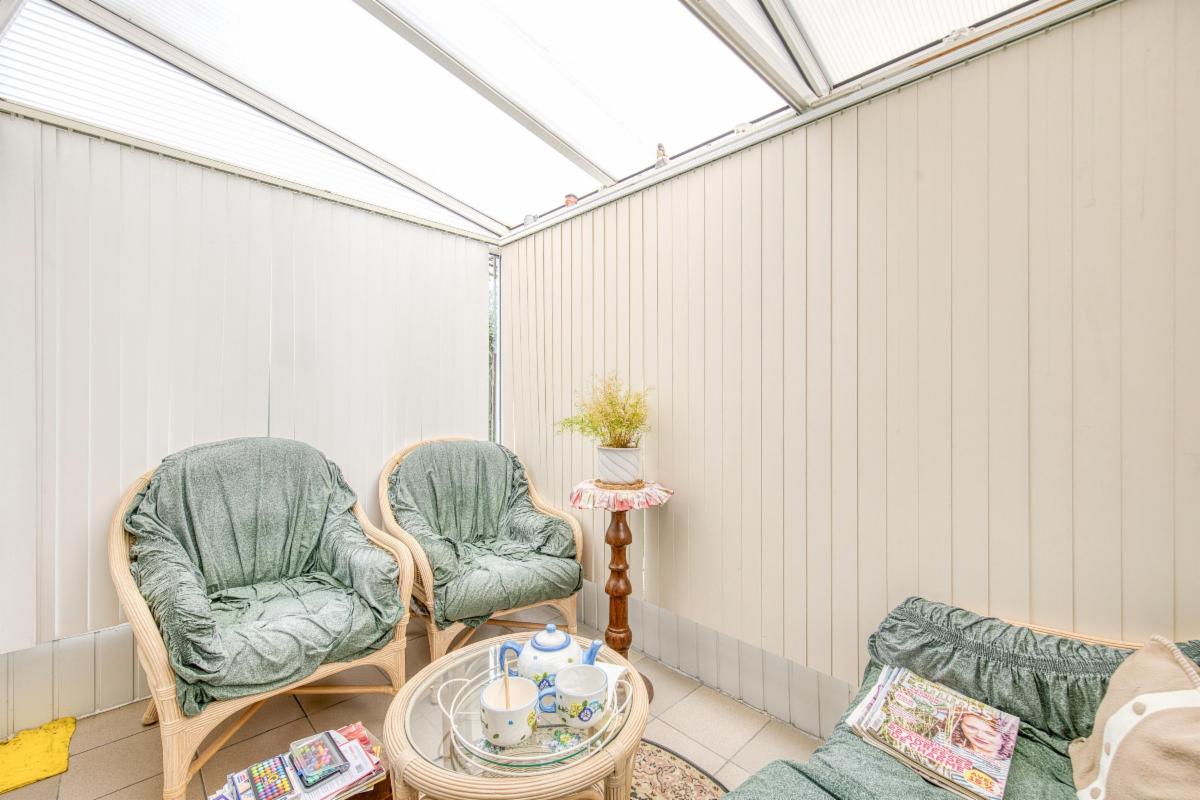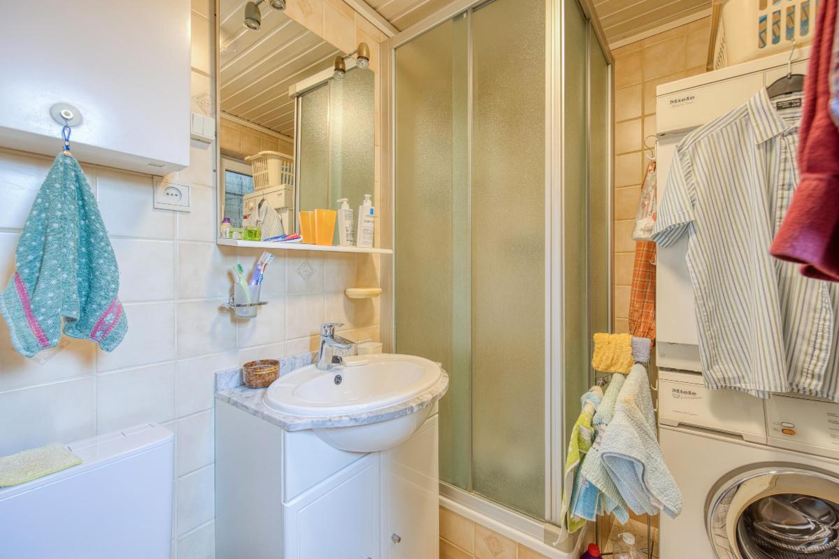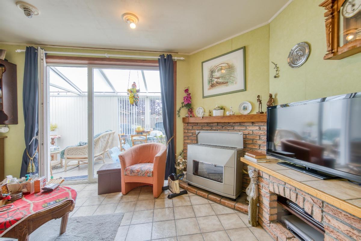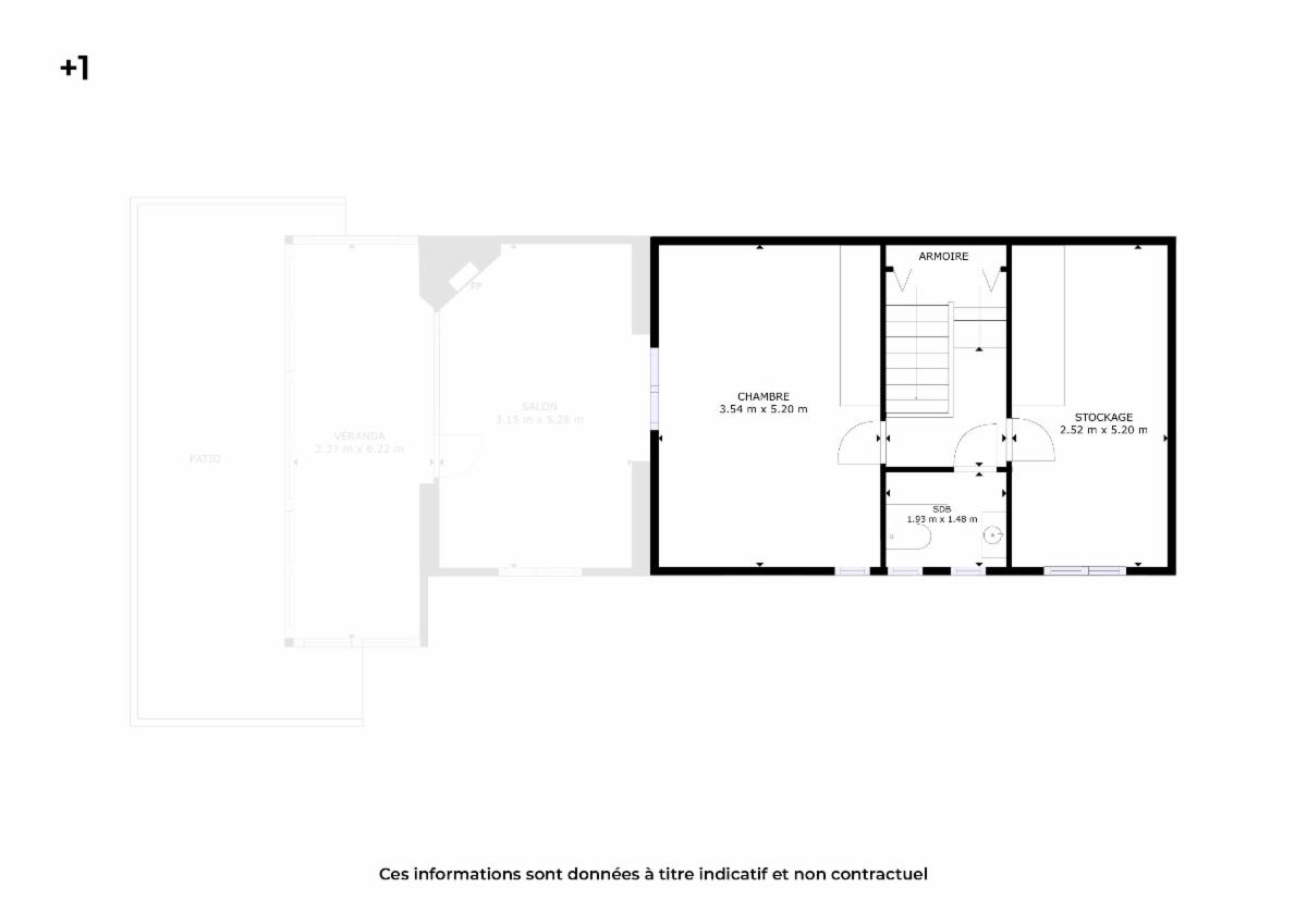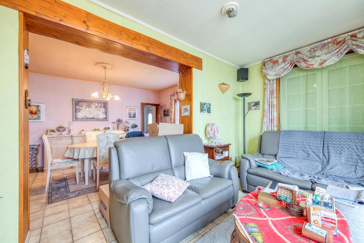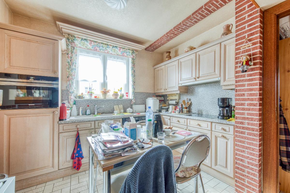 Rez : Hall d'entrée, living, cuisine équipée, salle d'eau (douche), véranda, terrasse, garage, abris et jardinet.