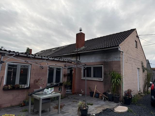 Maison 3 façades de plain-pied composée comme suit au rez-de-chaussée : un hall d'entrée, un séjour, une cuisine, une salle de bain, deux chambres. Extérieurs : passage latéral et jardin. Equipements: châssis double vitrage, chauffage au pellet, bien raccordé à l'égout, électricité non conforme, PEB "G". Visites sur rendez-vous pris en l'étude.