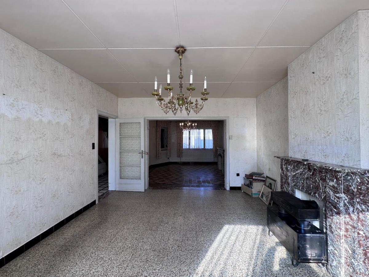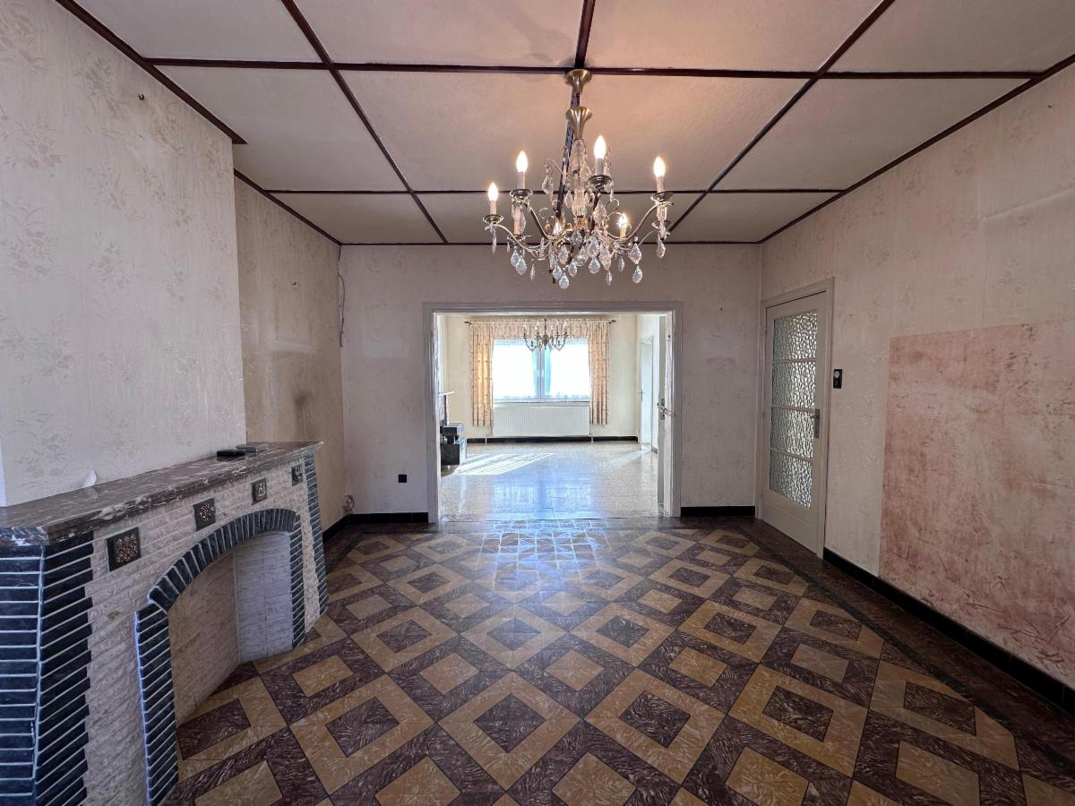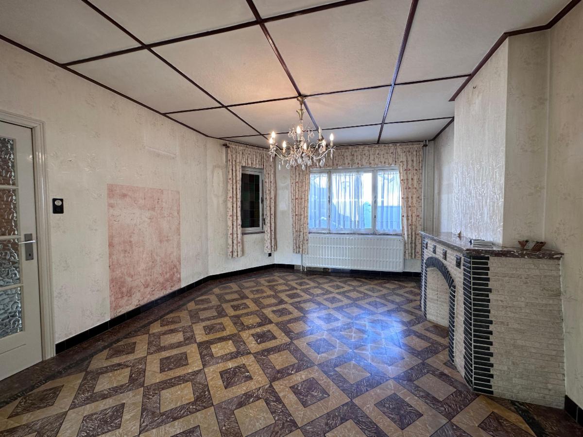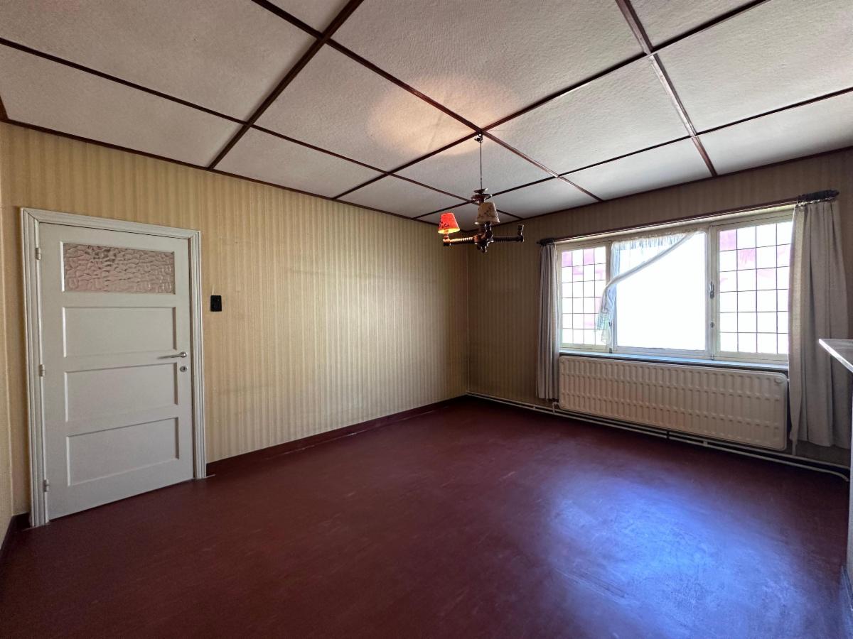 Au rez-de-chaussée: un hall d'entrée avec WC séparé, une pièce de vie spacieuse et lumineuse (+- 38m²), une cuisine à moderniser (7,5m²).