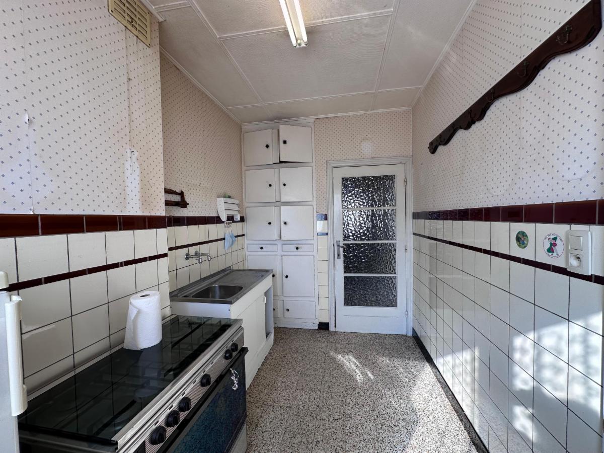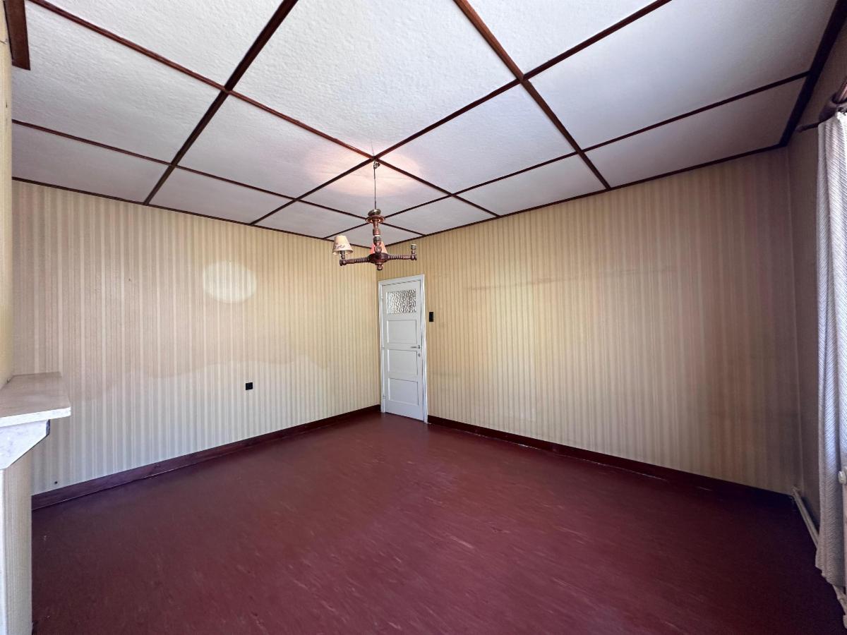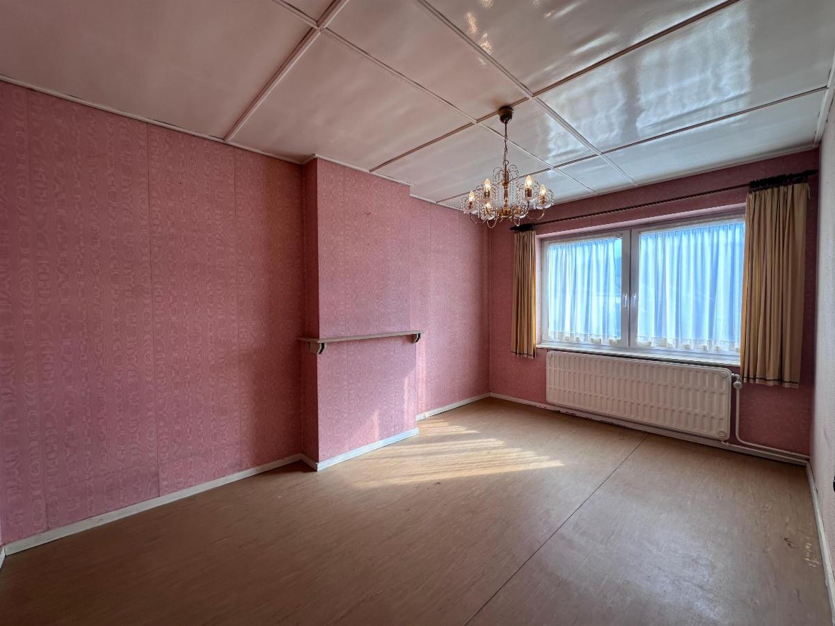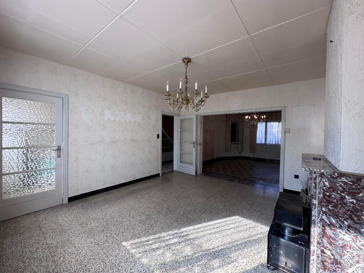 Au rez-de-chaussée: un hall d'entrée avec WC séparé, une pièce de vie spacieuse et lumineuse (+- 38m²), une cuisine à moderniser (7,5m²).