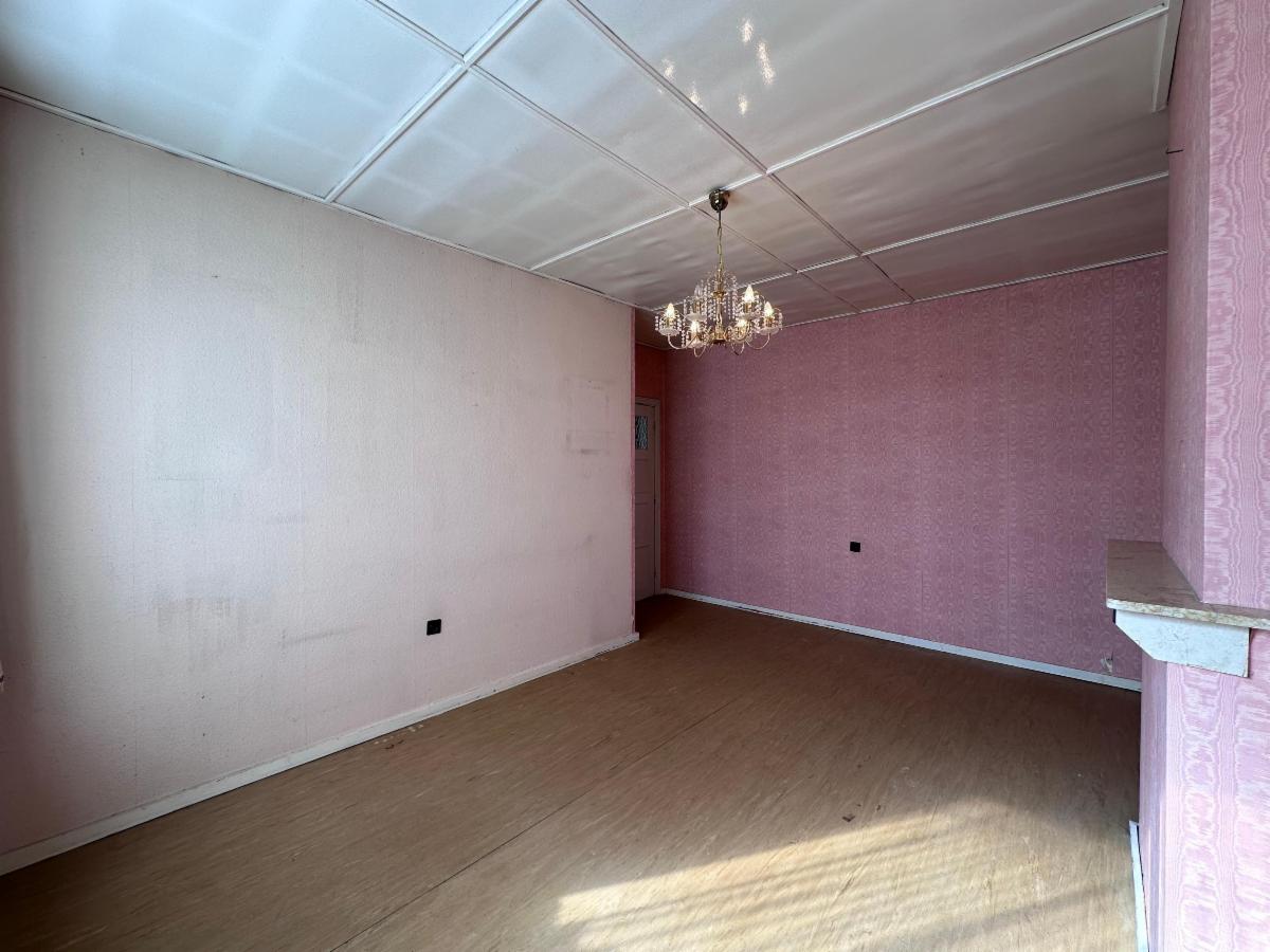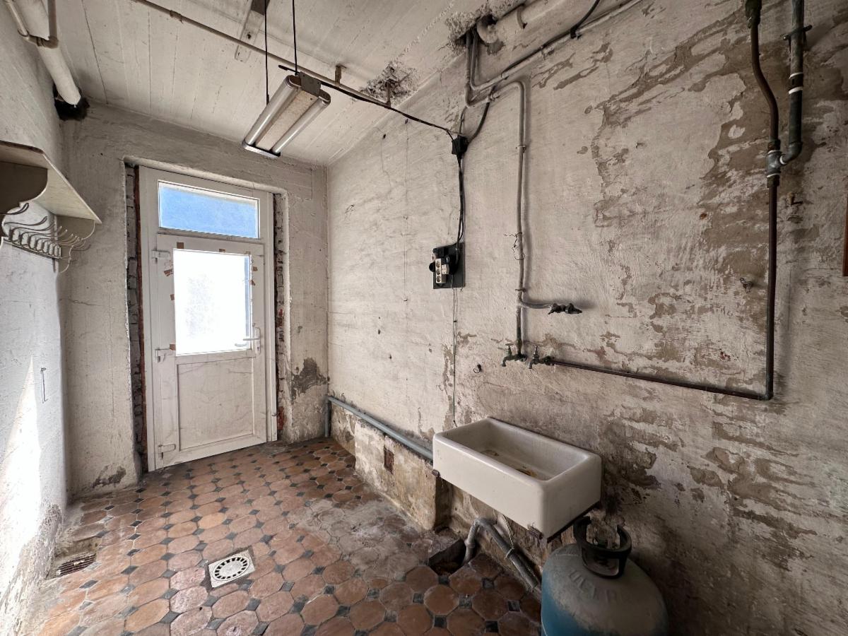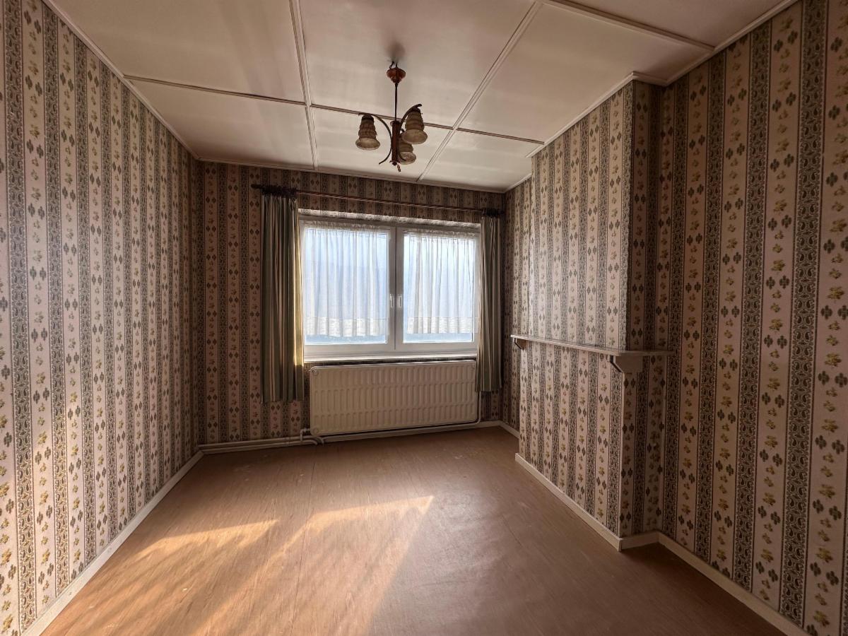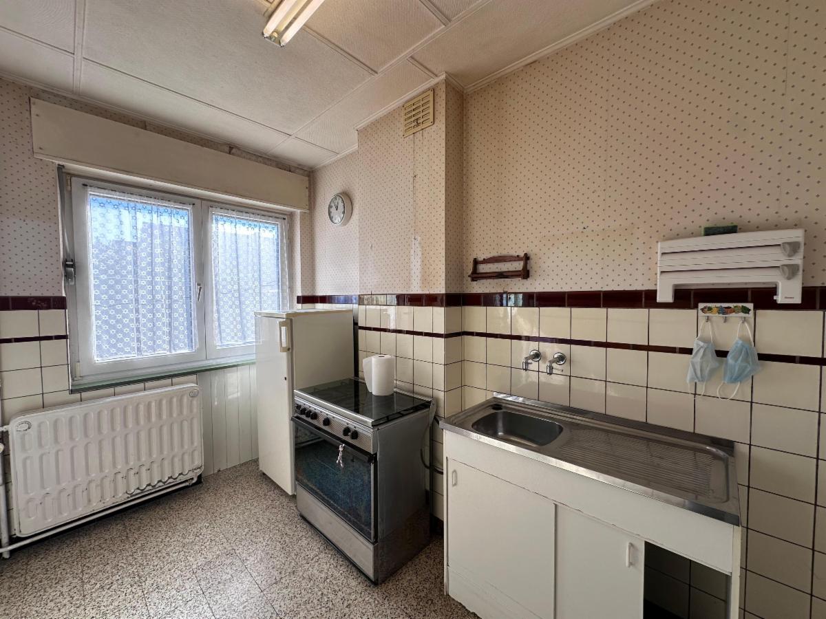 Au rez-de-chaussée: un hall d'entrée avec WC séparé, une pièce de vie spacieuse et lumineuse (+- 38m²), une cuisine à moderniser (7,5m²).