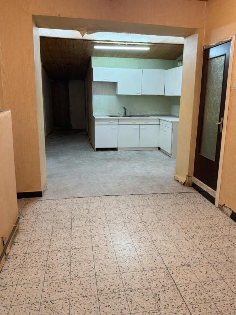 Rez-de-chaussée : Living - Cuisine non équipée - Salle de bain (Baignoire, lavabo simple, WC) - Buanderie