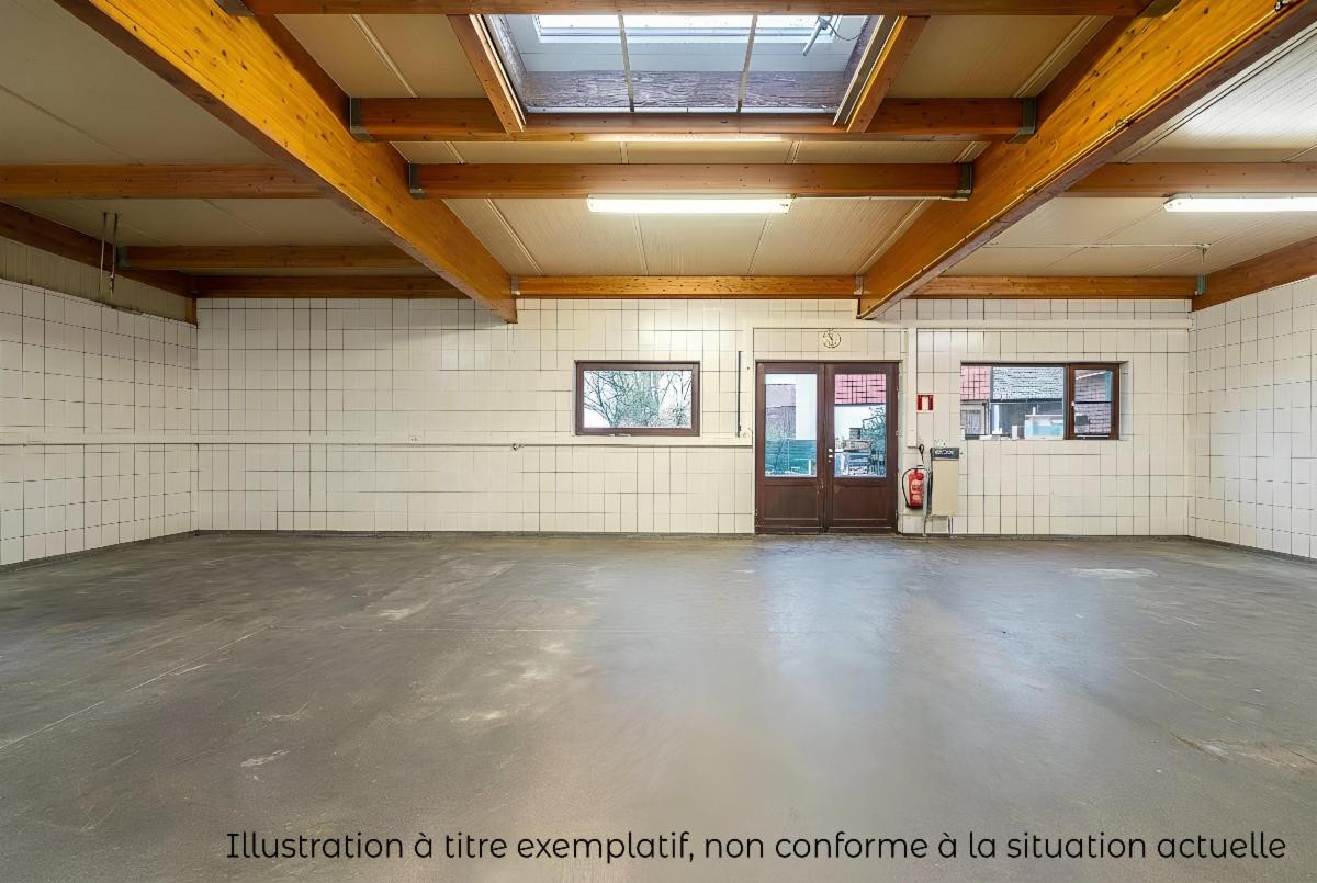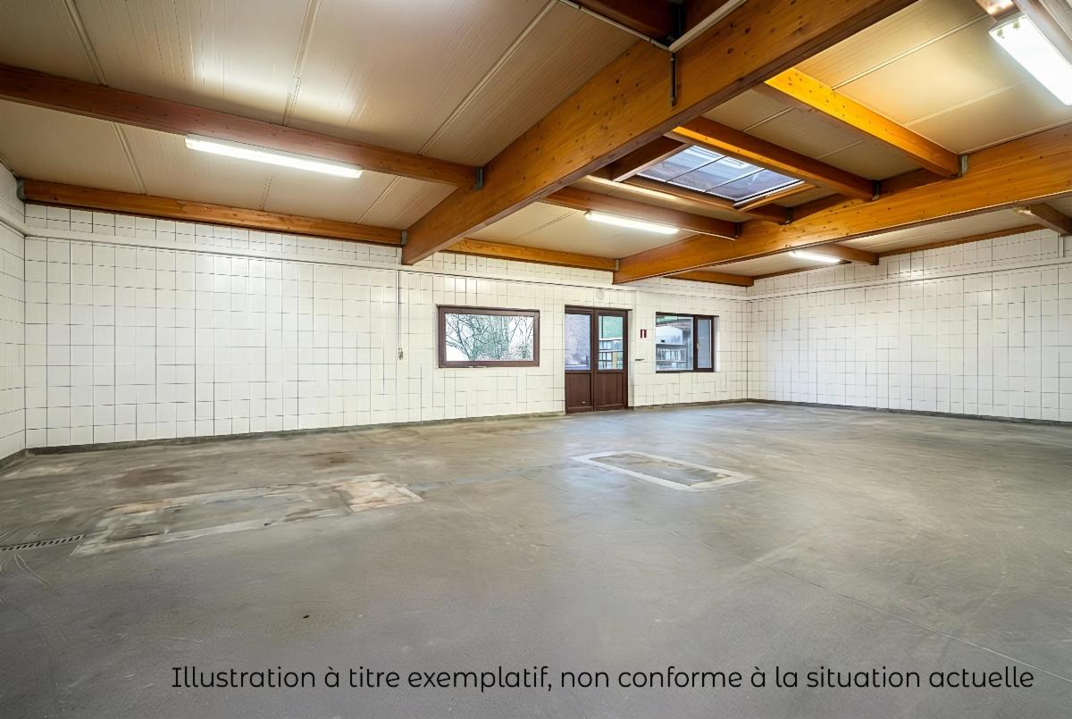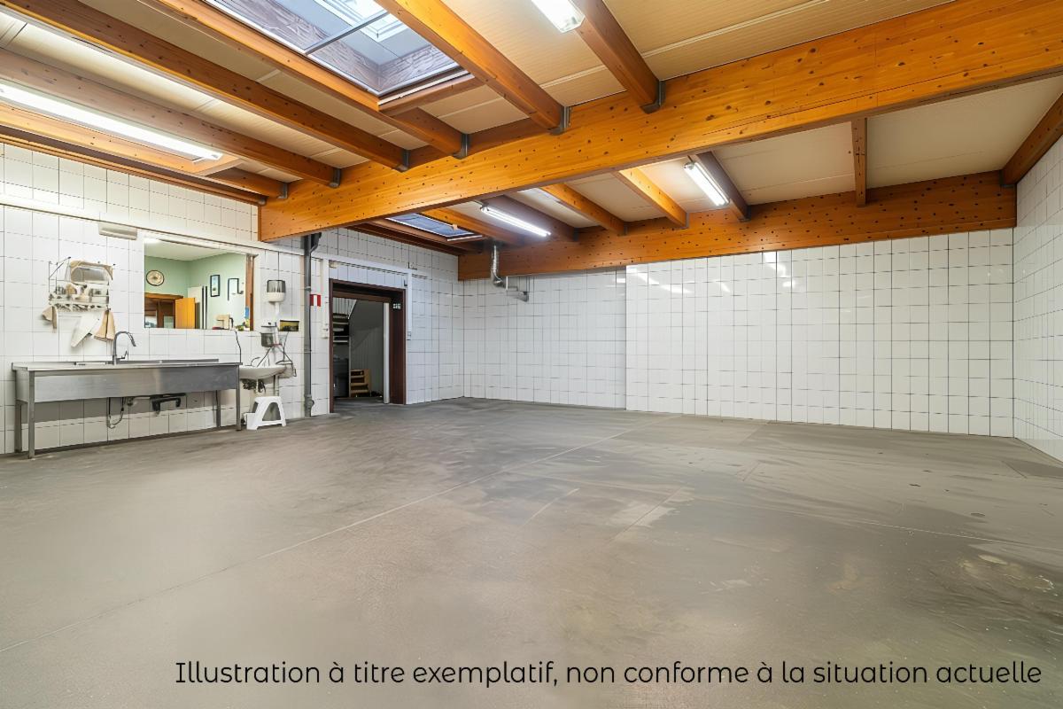 A l’arrière : une pièce d’environ 100 m² anciennement à usage professionnel donnant sur le jardin, buanderie, chaufferie.