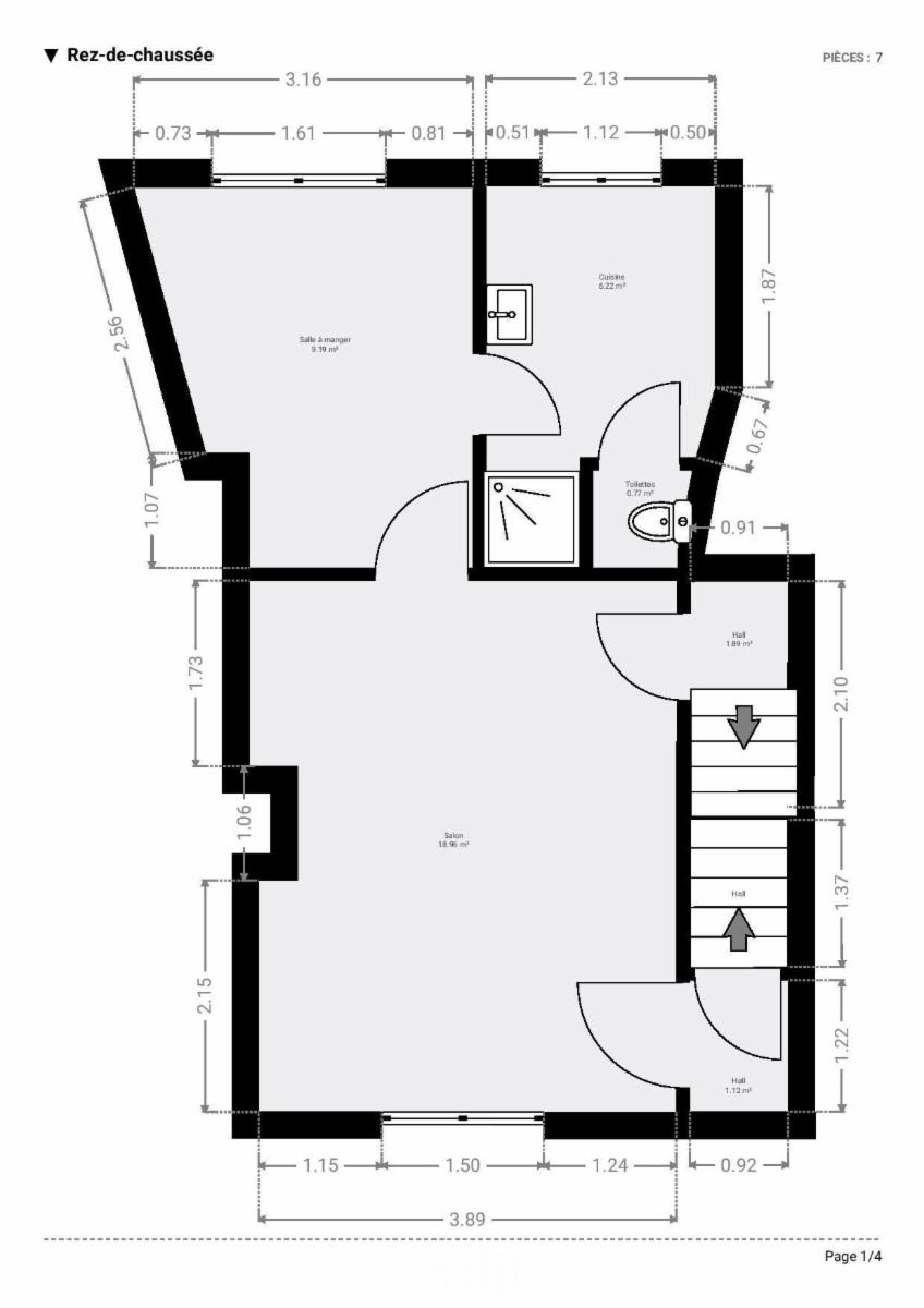 Rez-de-chaussée : un espace de vie comprenant un séjour de ±28 m² (18,96 m² + 9,19 m²) ainsi qu’une pièce d'eau/salle de bain avec toilette.