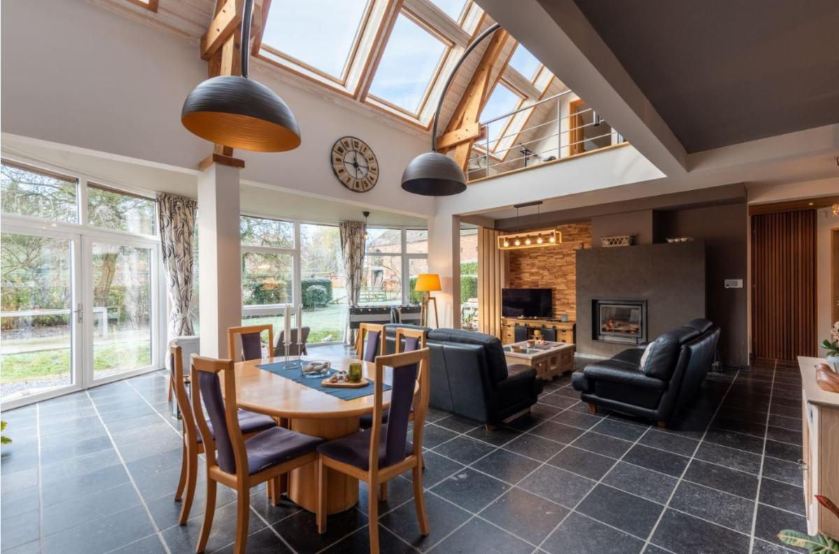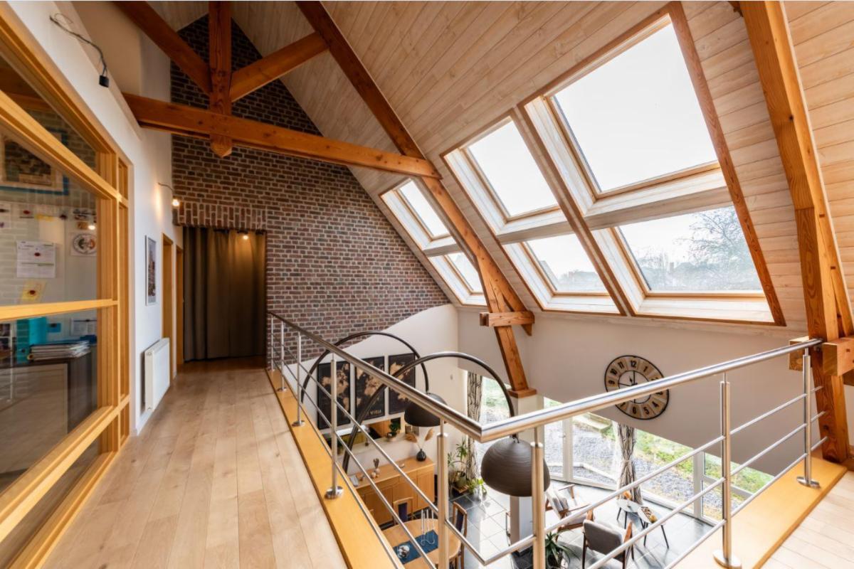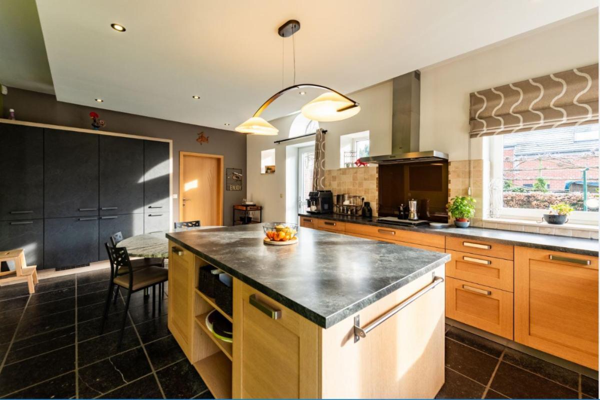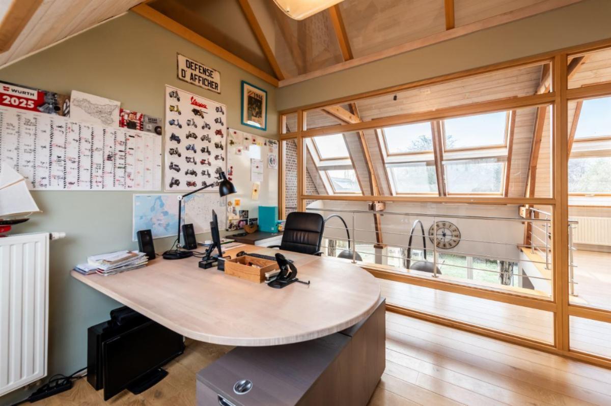 Elle se compose au rez: d'un hall d'entrée donnant accès à un vaste séjour avec vue sur jardin et ouvert sur une mezzanine, belle cuisine entièrement équipée avec "coin repas" et donnant accès au jardin, une buanderie/sellier et accès à la pièce technique (chaudière, machine à laver etc, ...) et 1 bureau.