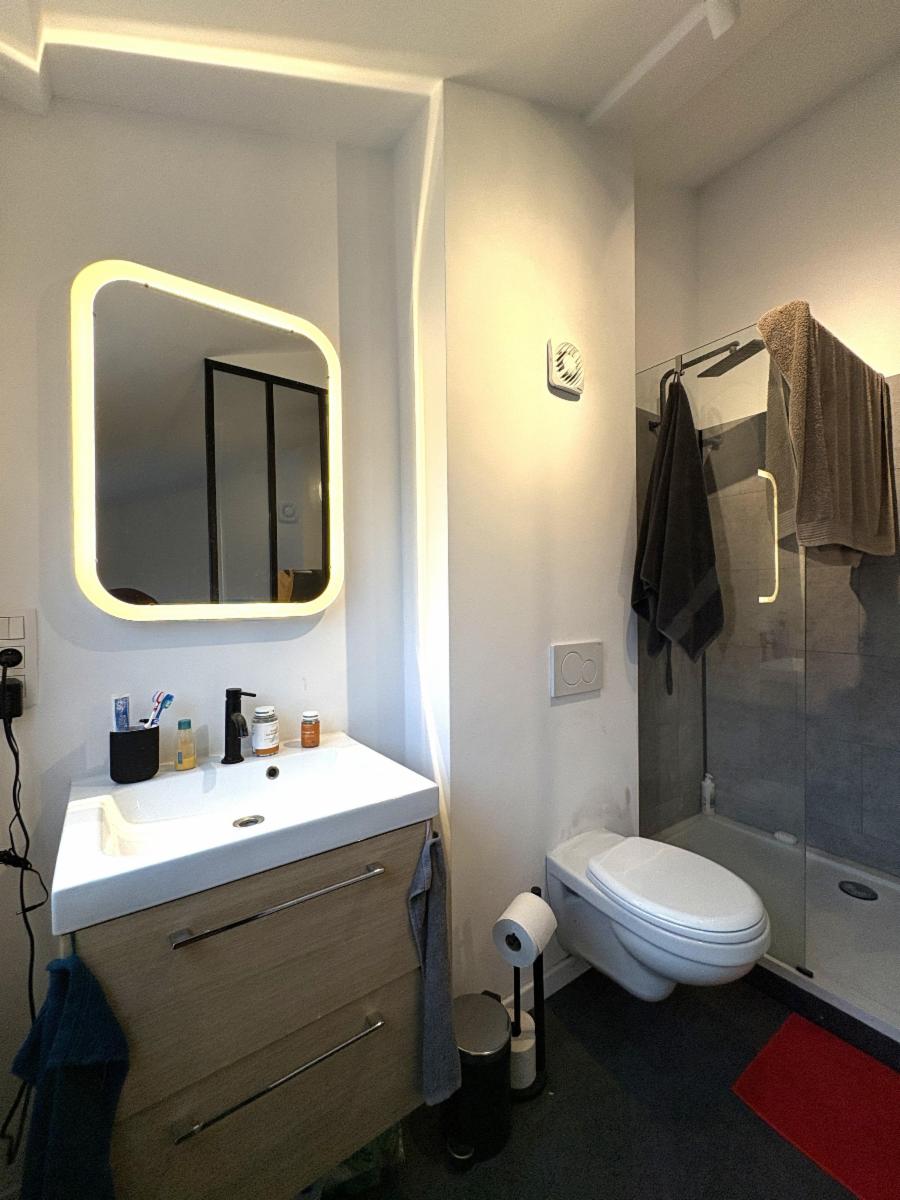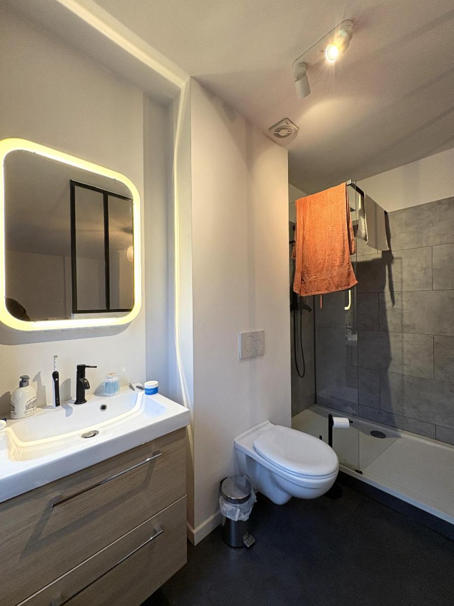 Rez-de-chaussée (espace commun) : hall d’entrée avec volée d’escaliers, cuisine équipée (avec accès vers l’extérieur), WC séparé avec coin buanderie, salon et salle à manger.