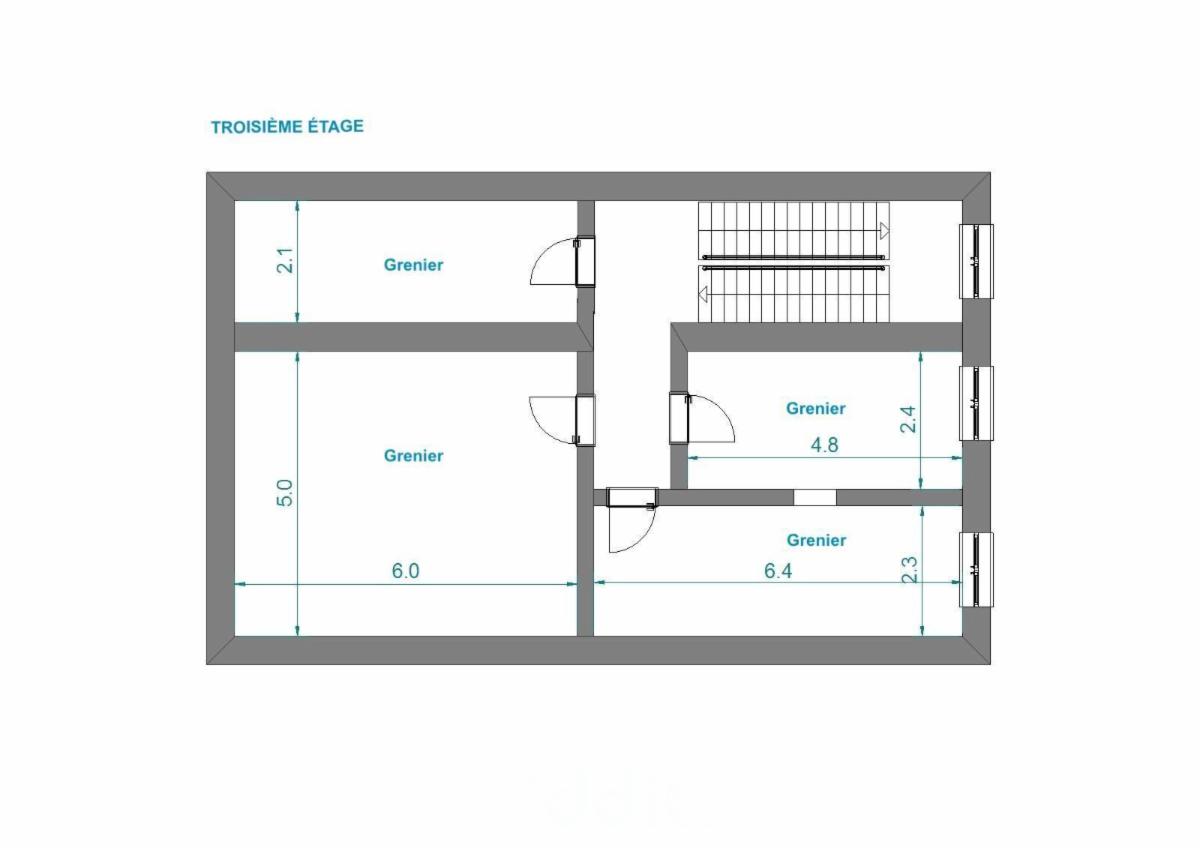 • Au troisième étage : un grenier d’environ 30 m² et 3 pièces d’environ 11 m², 12 m² et 14 m².
