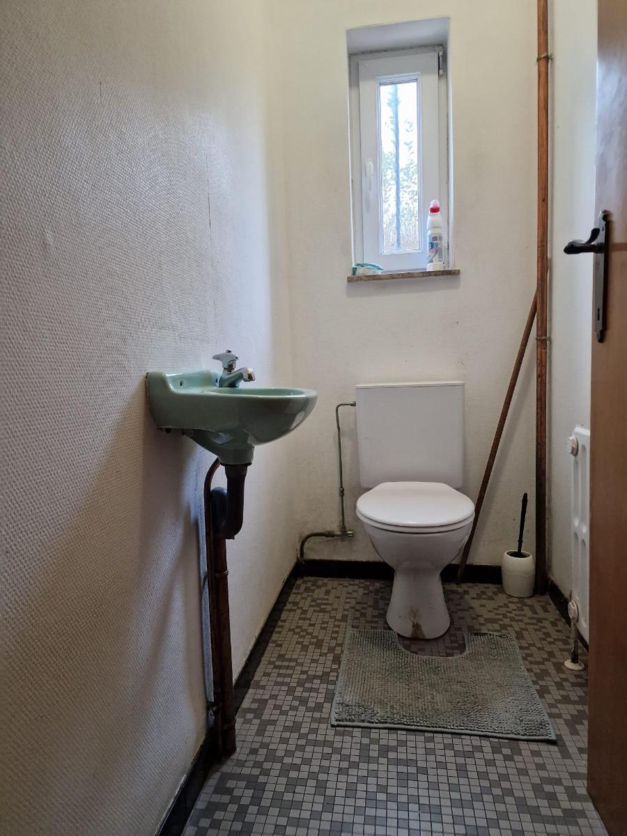 1er étage : cuisine (à rénover), grand séjour avec poêle à bois, véranda, 2 chambres à coucher, salle de douche, WC, passage latéral pour accéder à la terrasse arrière.
