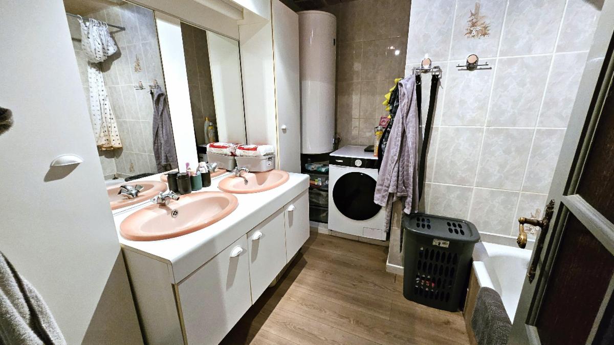 Un hall d’entrée, une pièce de vie avec espace rangement, un espace repas, une cuisine équipée (taque électrique, hotte, four, lave-vaisselle, frigo et lavabo), un WC séparé, une salle de bain avec baignoire-douche, rangements et meuble double vasque, espace buanderie. Terrasse et jardin avec chalet de jardin.