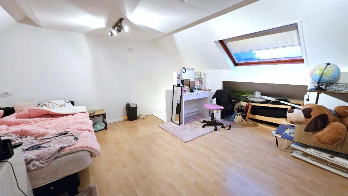 Au 2e étage : Grenier aménagé en chambre spacieuse et espace de rangement.