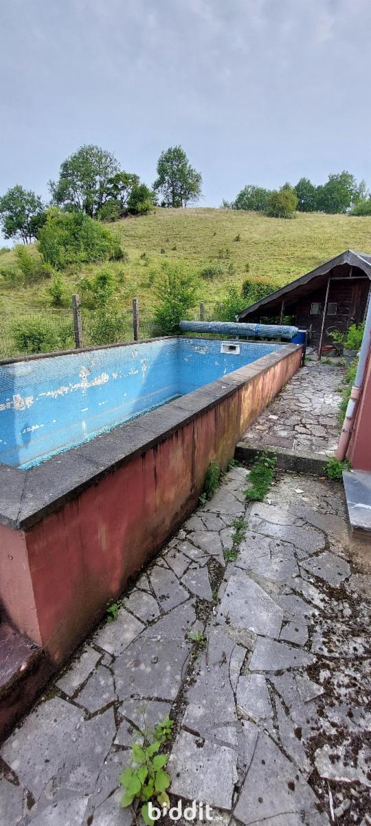 rez: hall d'entrée, wc, living, cuisine, petit balcon/garage/en sous-sol semi enterré: 3 chambres à coucher, salle de bains/cave/multiples pièces avec cave dont cave avec citerne à hauteur du jardin