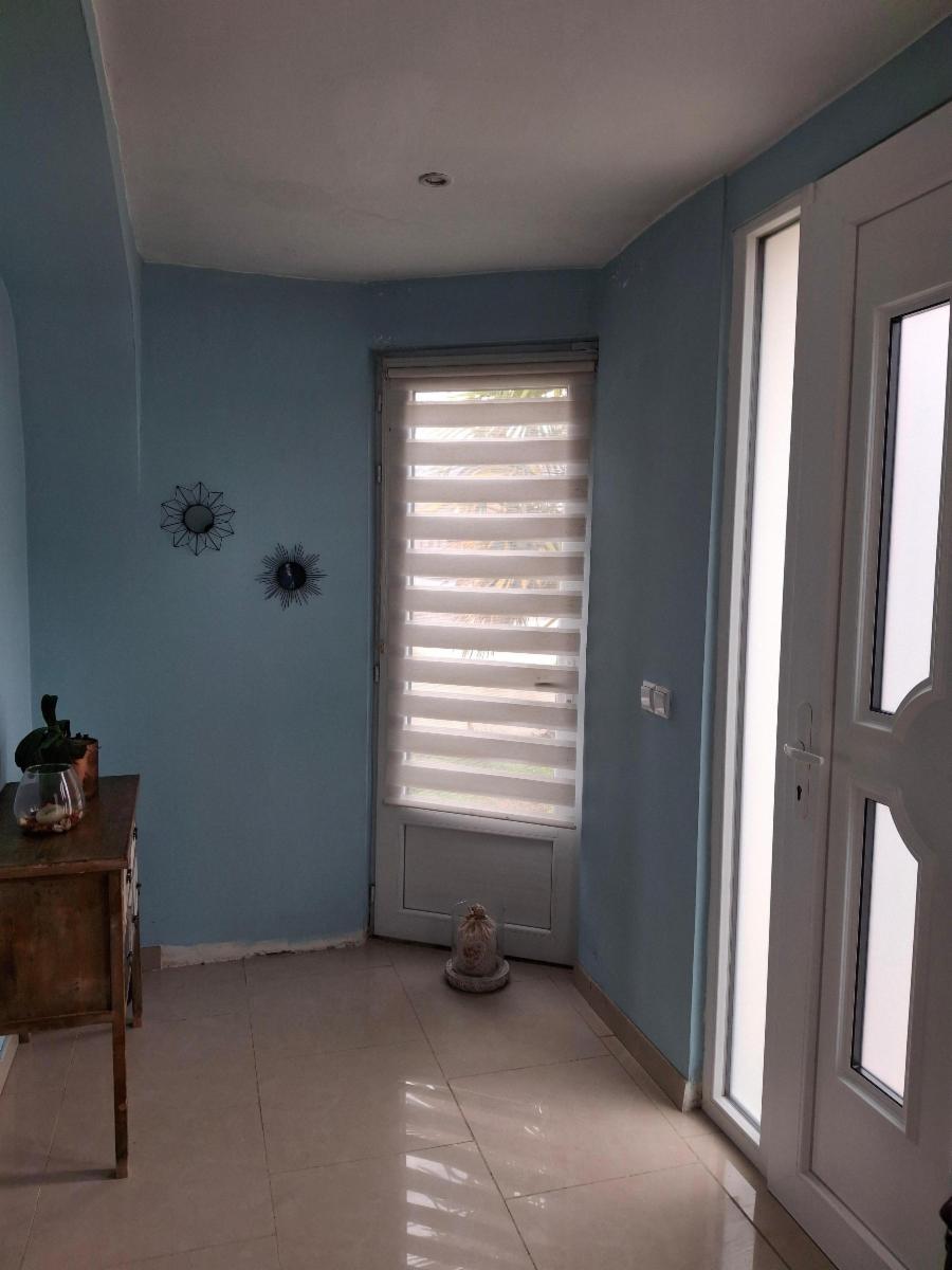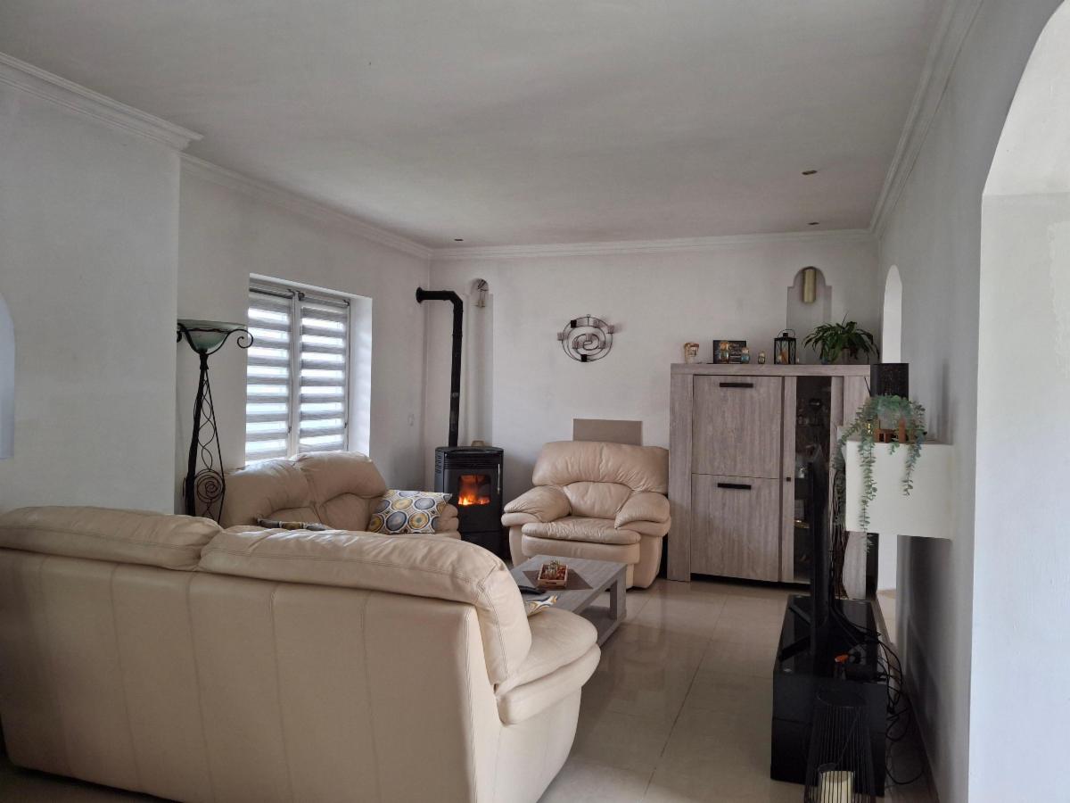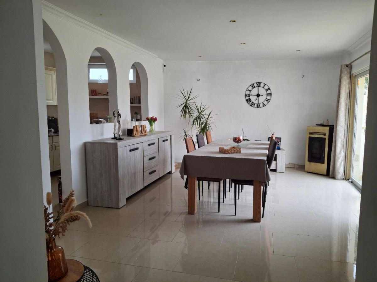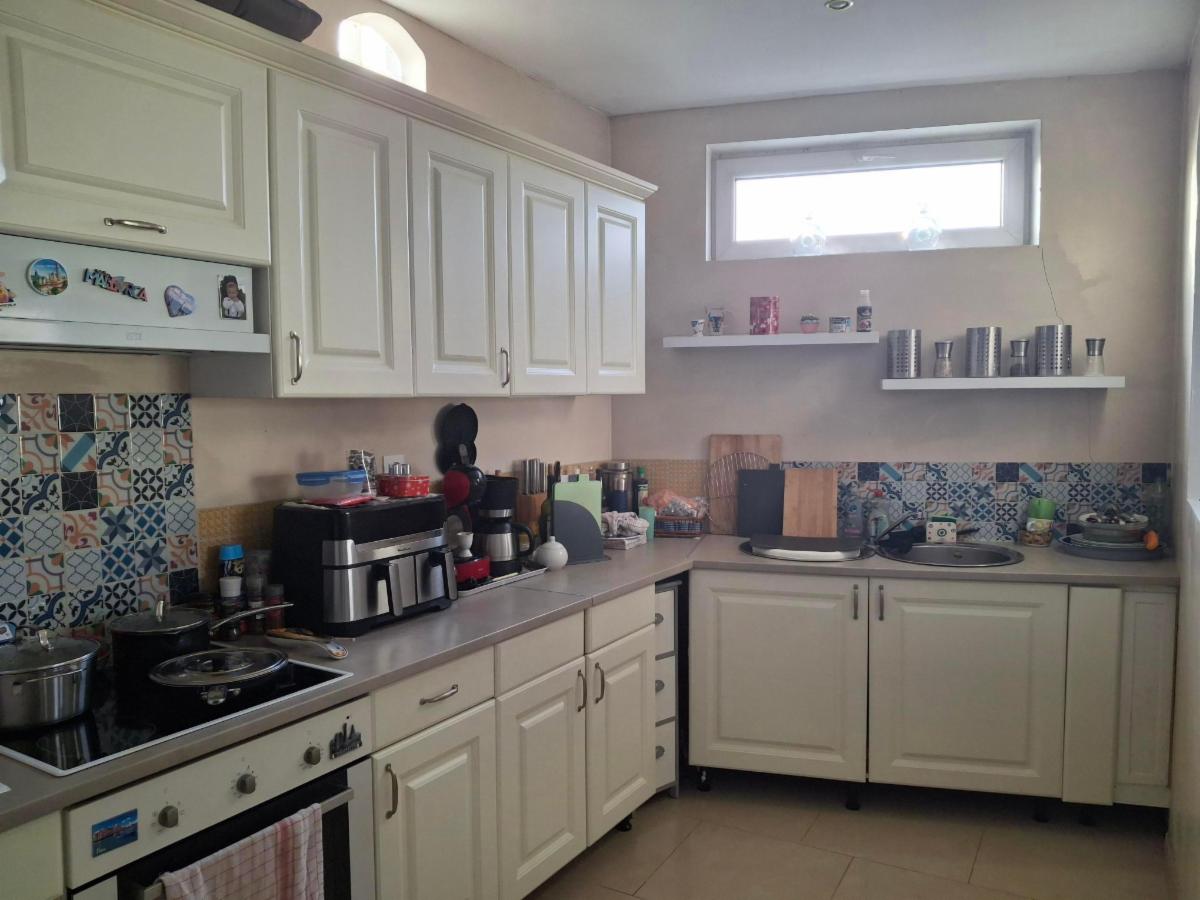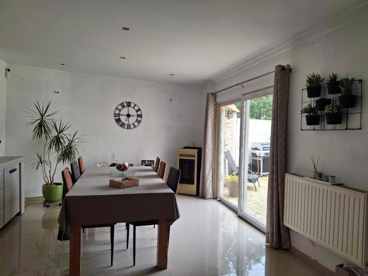 Au rez-de-chaussée : un sas d’entrée, un salon avec feu à pellets et escalier tournant, une salle de bains (w.c, douche, lavabo), une buanderie avec accès extérieur (espace machines), une chambre avant, une salle-à-manger, une cuisine (taque, four, hotte, évier, frigo), un cellier,