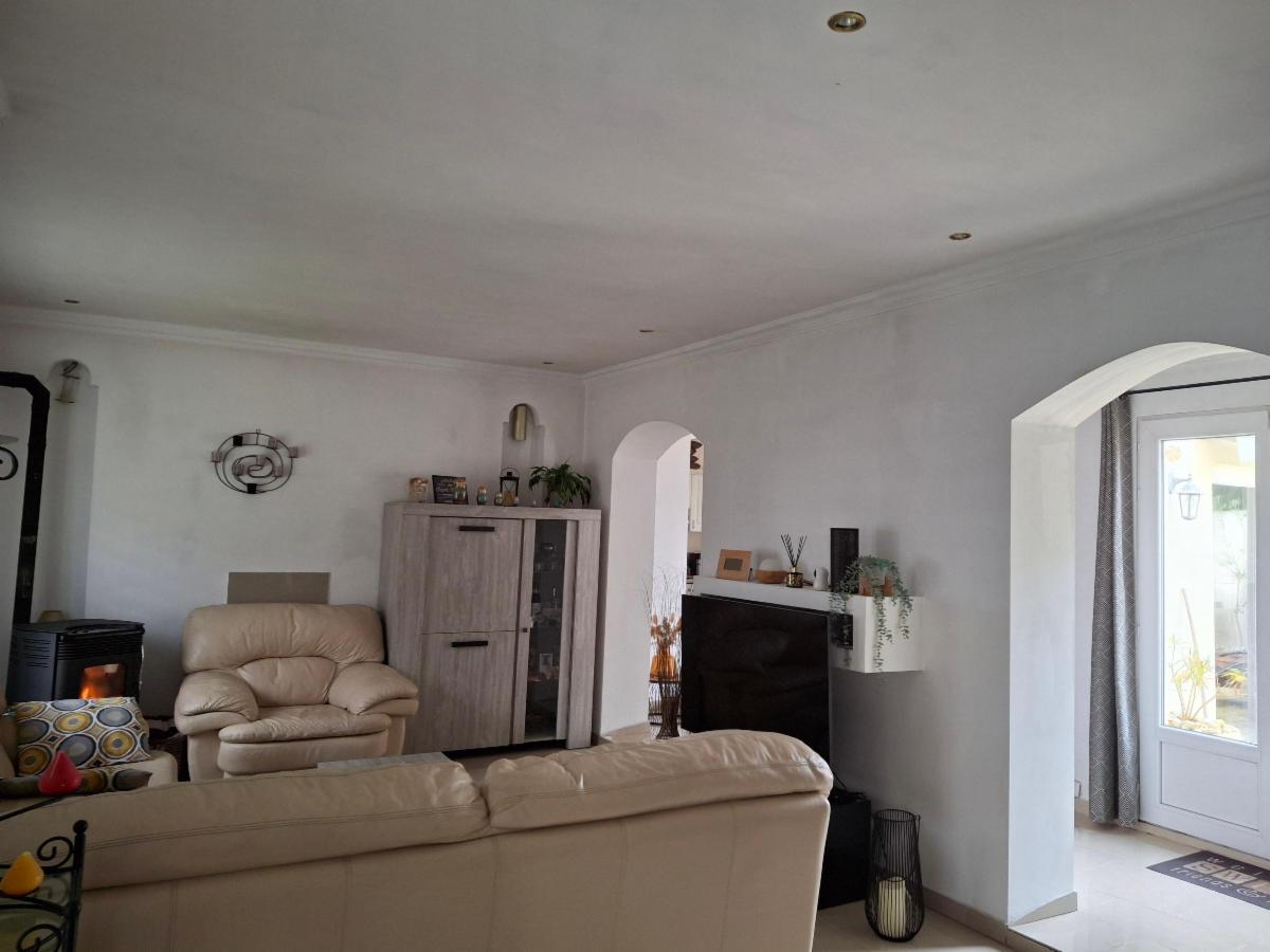 À l’extérieur : une terrasse avec bar arrière, un petit jardin, un carport à l’avant.