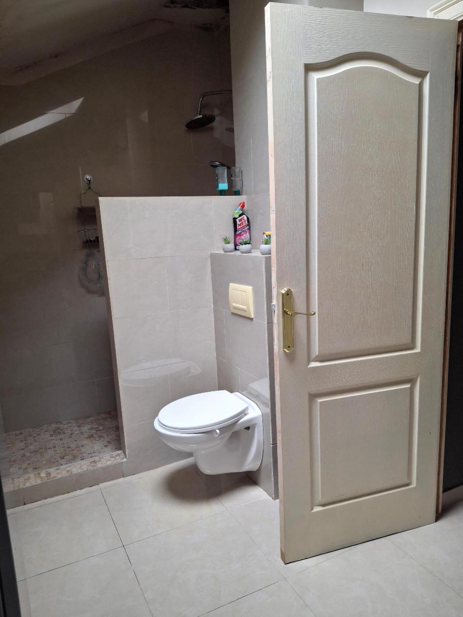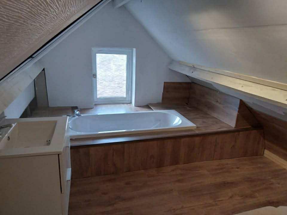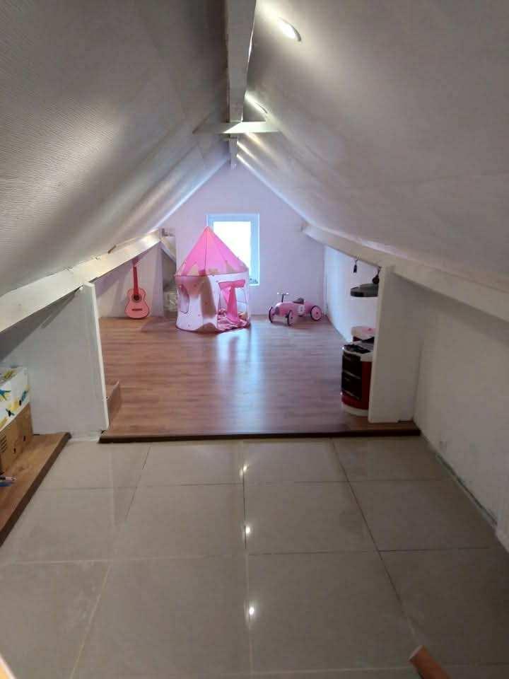 À l’étage : une pièce mansardée avec une chambre, et une salle de bains (non raccordée)