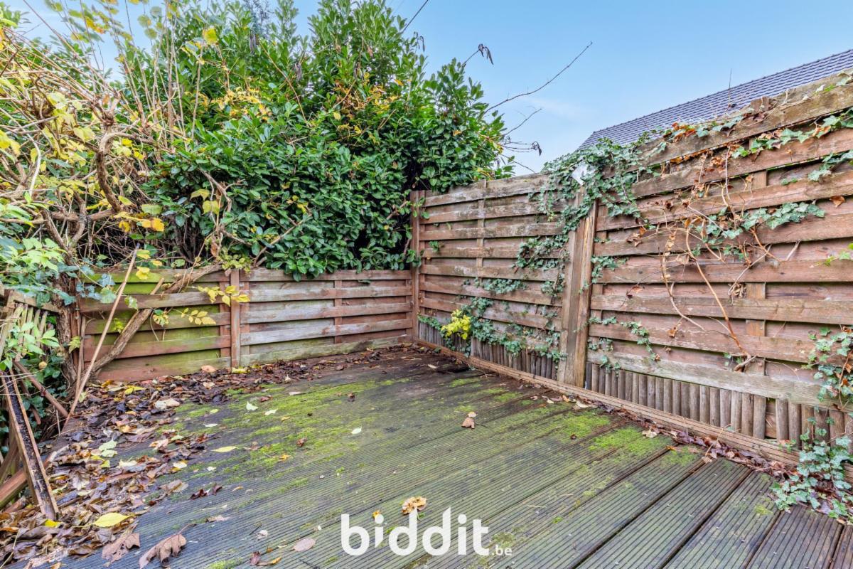 EXTERIEUR : petit jardin arboré avec en surplomb terrasse en bois et garage non-attenant.