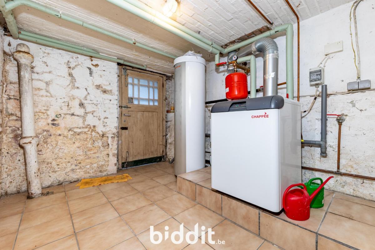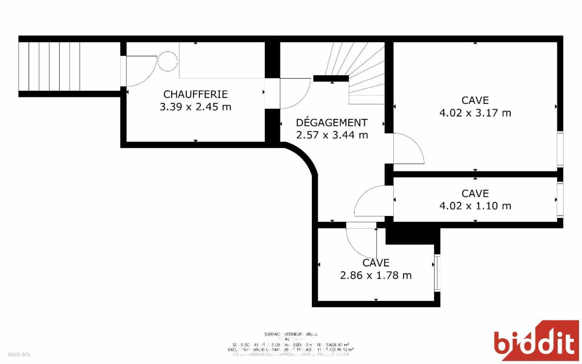 SOUS-SOL (carrelé) : Dégagement (2.75x2.8), cave (3.9x.3.15), cave 2 (3.95x1.1), cave 3 (2.85x1.7), local chaufferie avec accès extérieur (3.4x2.5 – chaudière – chauffe-eau Weishaupt) et coin machines.