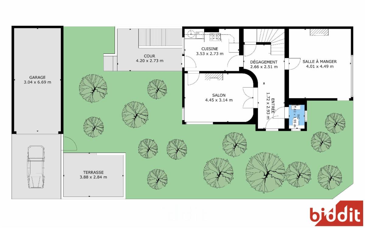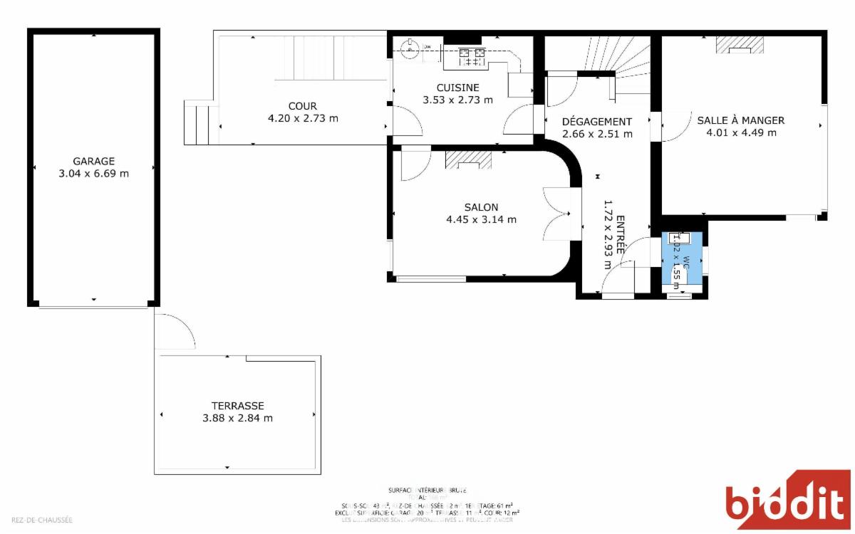 REZ : Hall carrelé en « L » (3.4x1.68 et 1.8x1.4), WC suspendu avec lavabo (1.3x0.95), séjour sur parquet avec accès cuisine (4.4x3), cuisine semi-équipée carrelée avec porte accès extérieur (3.5x2.7 – mobilier – lavabo – hotte – cuisinière gaz et combiné frigo-congélateur posé, salle-à-manger sur parquet (4.01x4.49).