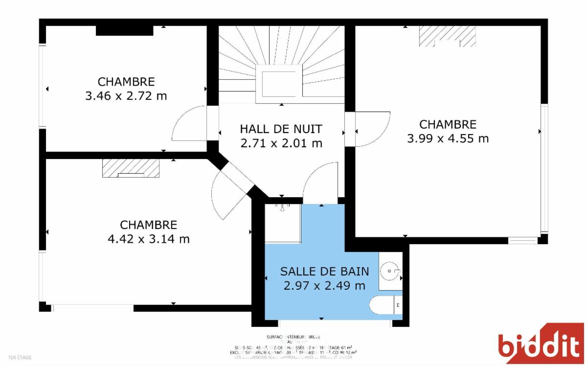 1ER ETAGE (plancher) : Palier (2.45x2), chambre 1 (3.47x2.68), chambre 2 (4.4x3.1), salle d’eau carrelée en « L » (2.5x1.7 et 1.45x1.25 – meuble avec vasque – cabine douche – WC), chambre 3 (4.48x4).