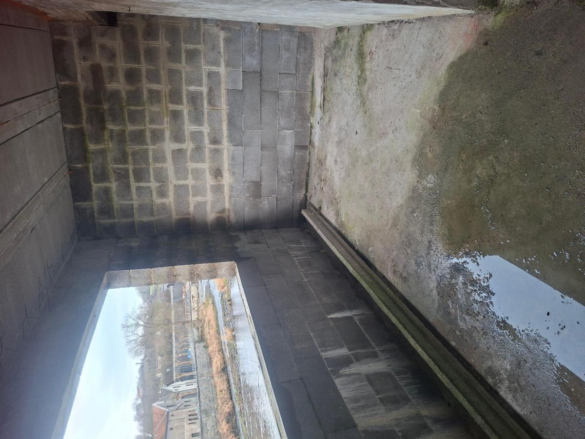 Le bien a été sinistré lors des inondations de 2021. Des travaux ont été entamés par le propriétaire, notamment la réalisation d’un mur anti-inondation, la pose d’une chape en béton armé au rez-de-chaussée ainsi que l’installation d’un clapet anti-retour sur le réseau d’évacuation. À l’arrière, la maison profite d’une vue dégagée sur le cours d’eau. Le mur anti-inondation, réalisé lors des travaux, crée un encadrement architectural qui met le paysage en valeur, à la manière d’un tableau.