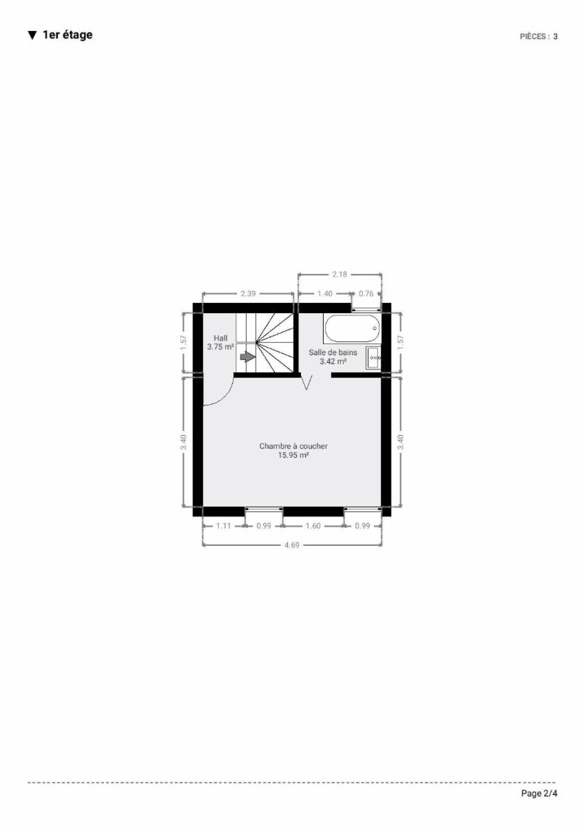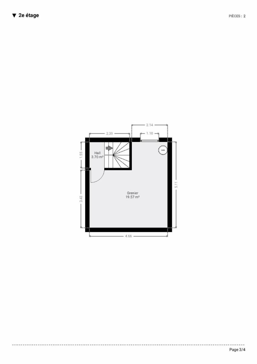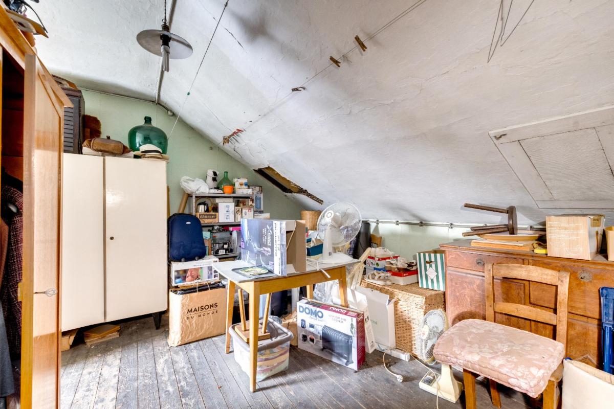 Au premier étage, la maison dispose d’une chambre et d’une salle de bain. Le deuxième étage accueille un grenier offrant un espace de rangement supplémentaire, voire un potentiel d’aménagement.