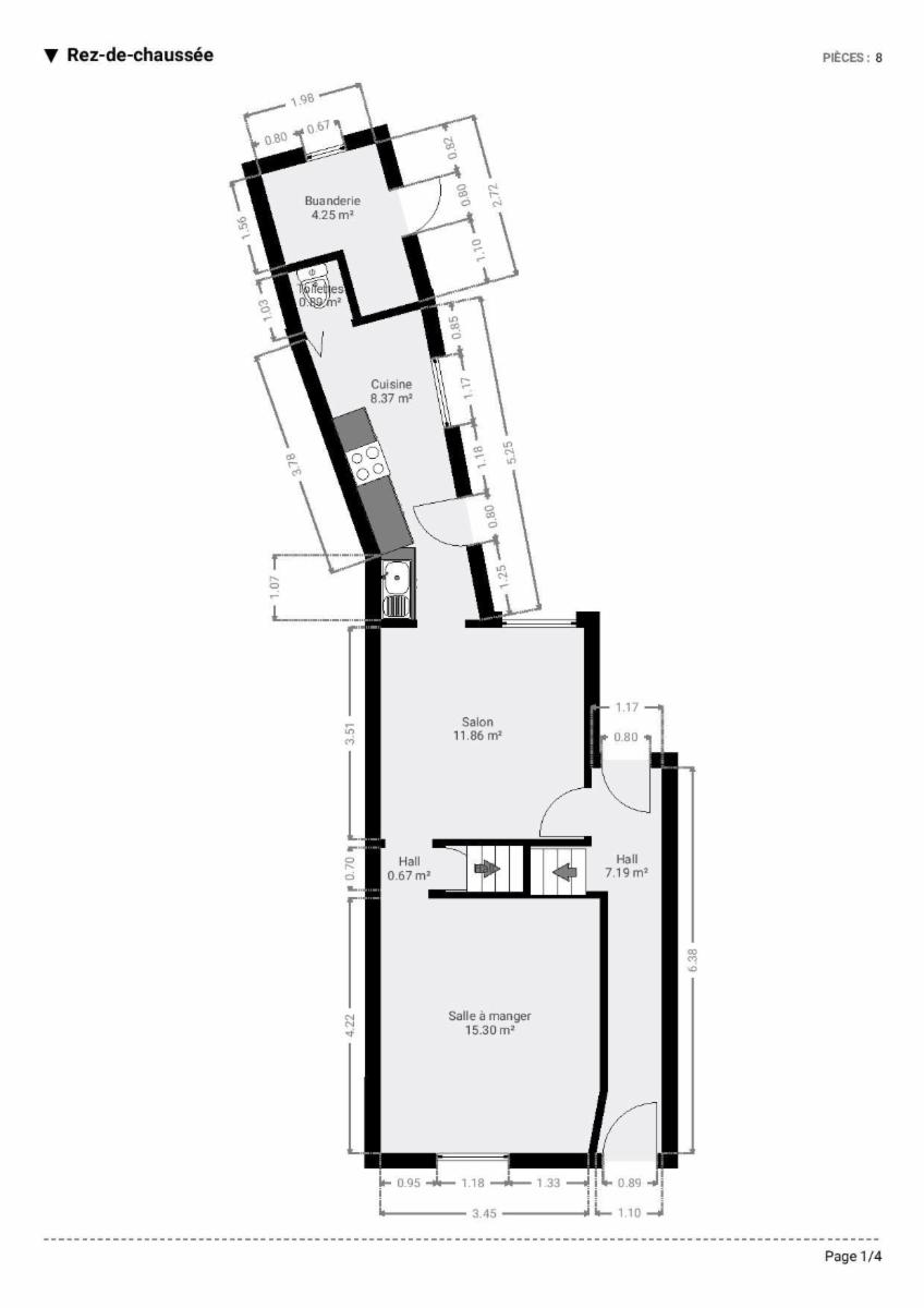 Elle se compose comme suit : au sous-sol, une cave. Au rez-de-chaussée, vous trouverez un hall d’entrée desservant un salon et une salle à manger, ainsi qu’une cuisine prolongée par une buanderie et un petit jardin.