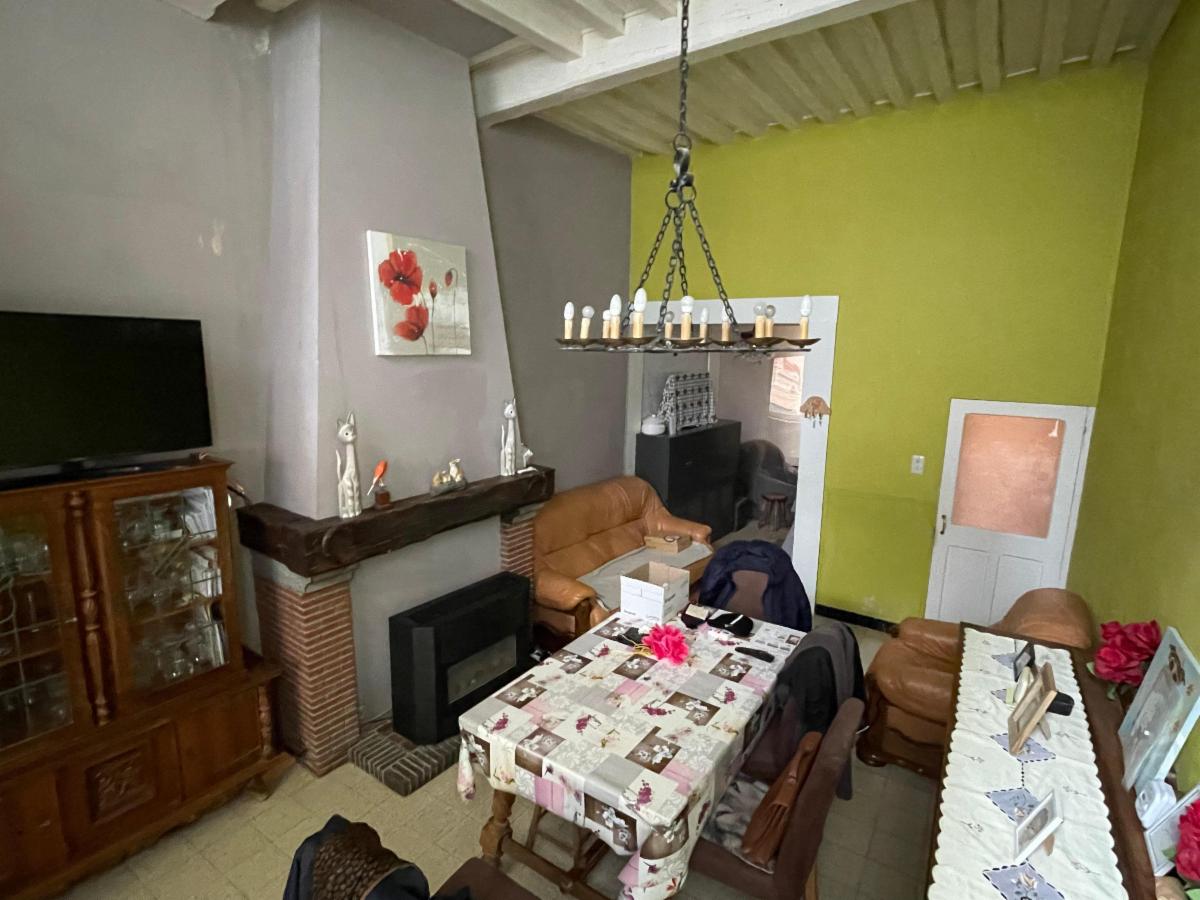Au rez-de-chaussée : un couloir, un petit salon à l’avant, une salle-à-manger avec feu au gaz, une cuisine équipée simple (évier, taque de cuisson 4 foyers, 1 hotte et 1 frigo), un petit débarras avec espace machines et « courette fermée », une salle de bains (baignoire, wc),