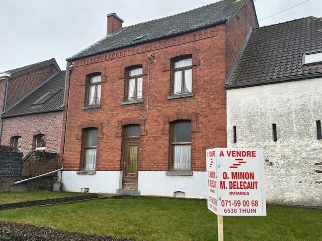 Bonne maison d'habitation idéalement située à Thuin, comprenant une pièce de séjour (armoire murale), un living, une cuisine, remises, à l'étage 2 chambres, un bureau et une salle de bains, un grand grenier, cave, chauffage central mazout, jardin, le tout sur 5 ares 65 centiares, RC 551 euros, prix indicatif, vente au plus offrant, annonce non contractuelle