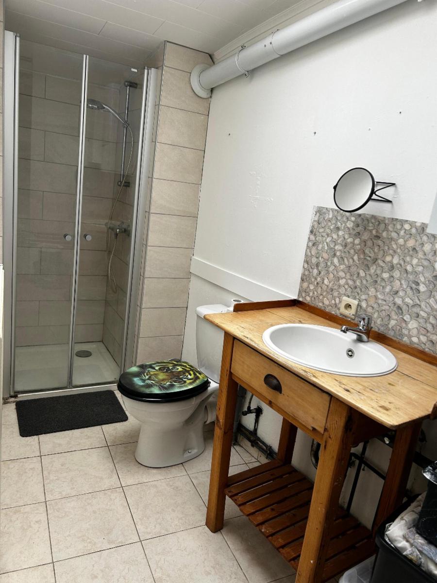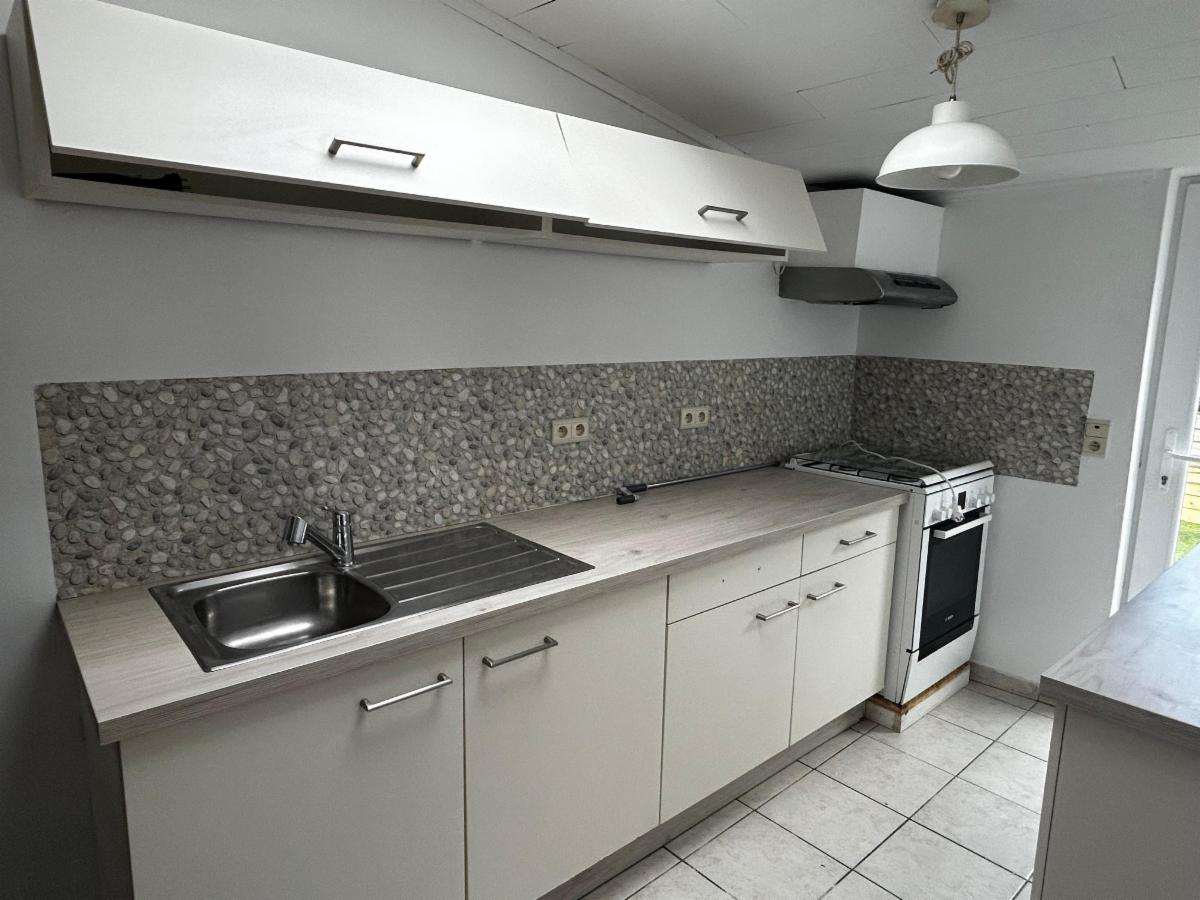 Au rez se trouve une pièce de vie (salon, salle-à-manger), une cuisine, une salle-de-douche (douche, évier, wc).