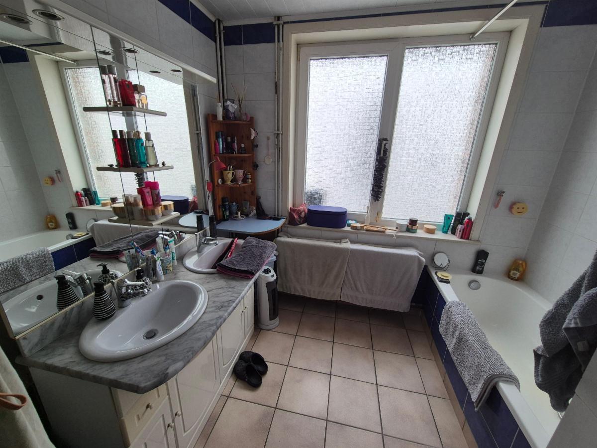Au RDC, le hall d'entrée (13 m²) et le salon (45 m²), organisés en deux pièces avec superbe carrelage d'époque, une salle à manger de 12 m² avec rangement encastré, une cuisine super-équipée (évier simple, taques vitrocéramiques, four électrique neuf, rangements, lave-vaisselle neuf, hotte), couloir (2,5 m²), salle de bains (douche large, baignoire, deux éviers, miroir, rangement) (7,5 m²), buanderie avec WC séparé (10 m²);