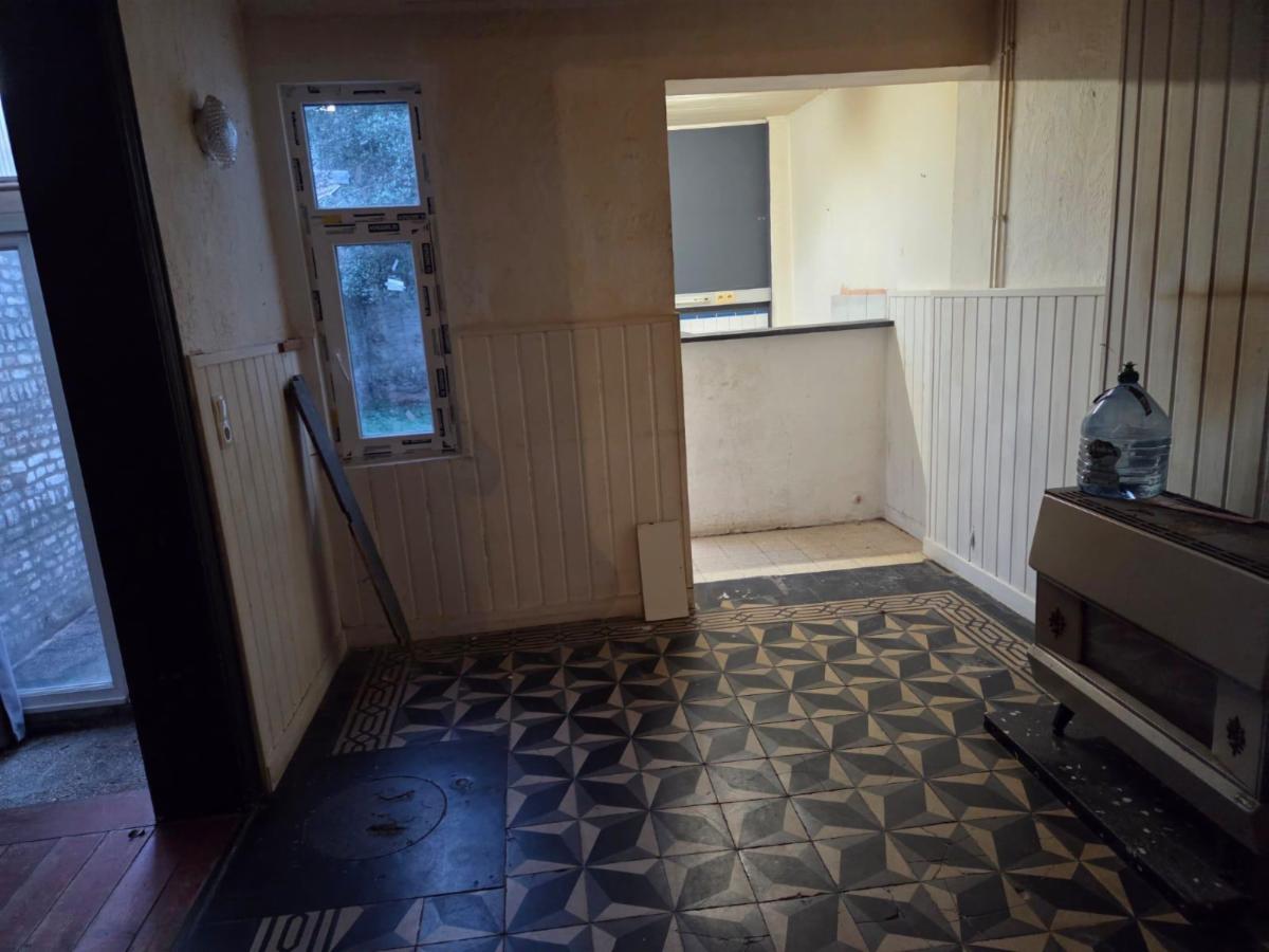 Rez-de-chaussée : un hall d’entrée, sur la gauche un bureau avec plancher en bon état, un salon, une pièce de vie et un salon d’hiver-véranda, un WC ainsi qu’un espace prévu pour la cuisine.